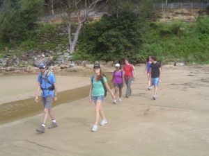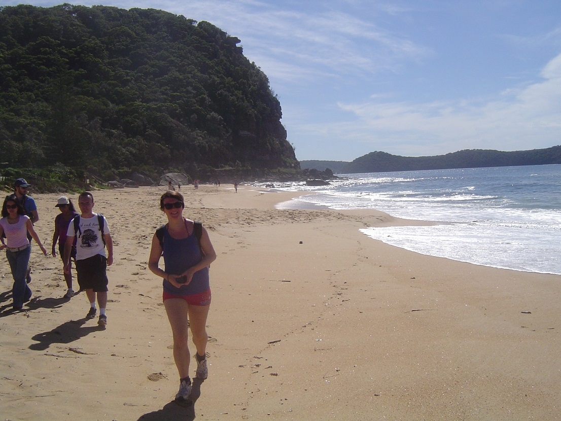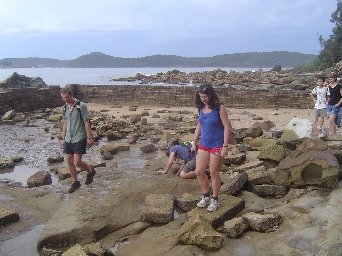 Anyway, we then set off south along Umina Beach, past a surf carnival that was just starting, and found that because of the previous day’s storm, Ettalong Creek was up (normally just an isolated lagoon) which required a creek crossing. Then it was round the headland of Mt Ettalong and as the tide was up it required a fair amount of boulder-hopping until we reached the flat rock platform. From there it was a short scramble up to the old road which is now an unofficial walking track to Pearl Beach – unofficial because Gosford Council has put warning signs on the track about falling rocks and suggesting people don’t use it! Then it was another clamber down to the northern end of Pearl Beach and we walked the length of the beach. It was already becoming a very warm day.
