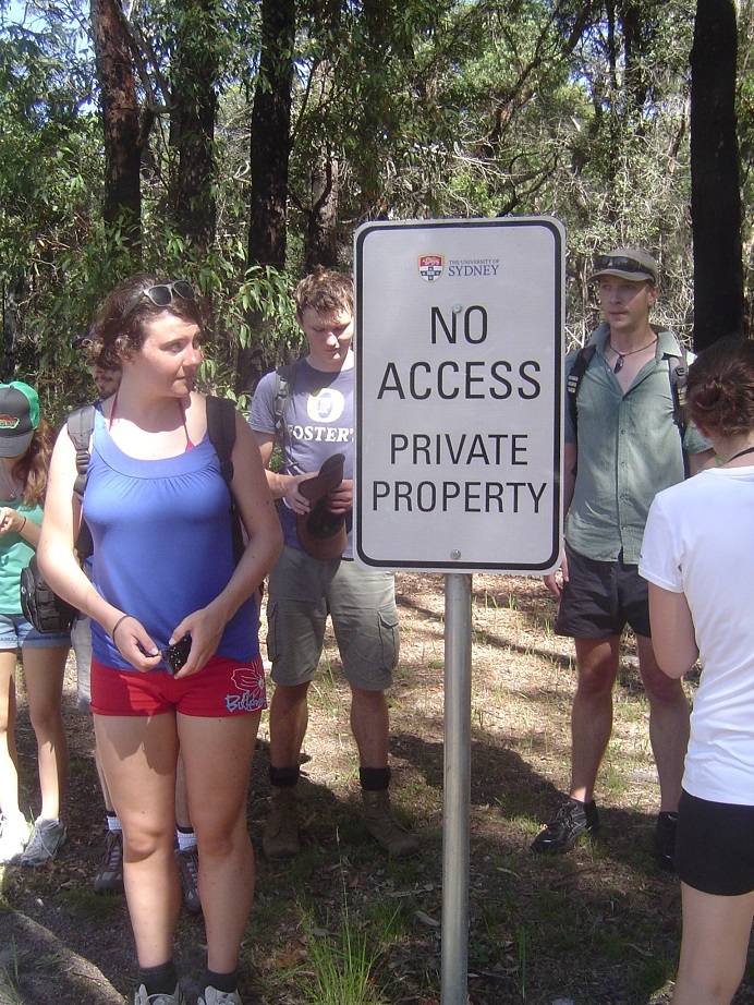After a water break in the shade we the did a shortish street bash to the Crommelin Native Arboretum (which is also next door to a Sydney University research station). After a circuit of the Arboretum we sat down for a morning tea break, and Nina offered a plum to a Butcher Bird which had landed beside us expecting some treats. Before this bird could get the plum, a Kookaburra swooped down and snatched it away! Before long two more Kookaburras had arrived and encircled us, hoping for more handouts. But it was bad luck Kookaburras as we then left to go along the track up the hill to Warrah Lookout.