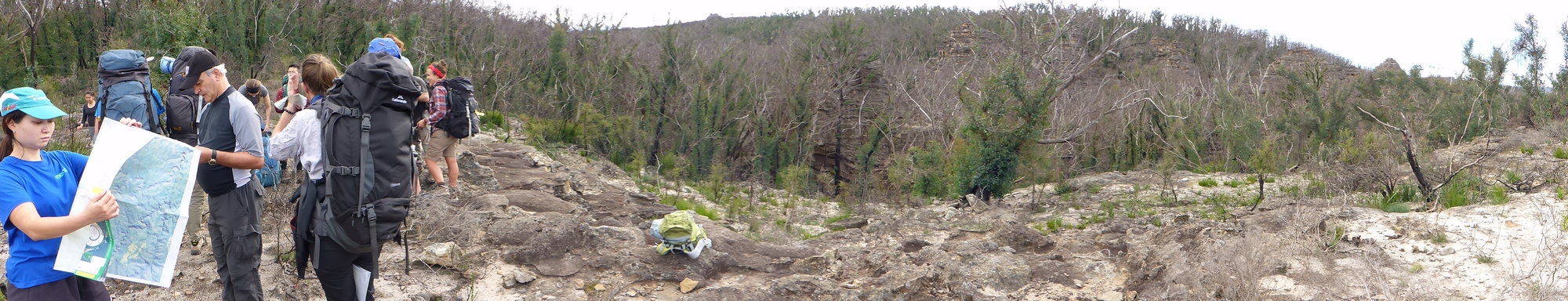Armed with maps, compasses and some knowledge of contour lines, we headed north from Bell and into country that was burnt in last year’s Lithgow Mines fire. We stopped often to inspect maps and deduce our location just by looking at the contours and remembering what we had passed through. In this way we eventually reached spot height 994 with its panoramic views of the surrounding area. Here we had an early lunch and began to learn how to use the compass to take bearings and identify surrounding features on the map. A course was set for our afternoon’s walk, the challenge was set to reach a junction of two fire trails with pinpoint accuracy. There was a short steep descent into the Wollangambe, a river crossing and a steep climb out the other side. People took turns to lead, following the compass whilst at the same time following a ridge, using the natural lie of the land to stay on track. The country was slowly recovering from fire, black spikes protuded from the ground and these impaled even thick soled shoes. And some pungent smelling shrubs were making a comeback, so sweet and exotic was the smell of these plants we wondered about adding some to our tea. The fire had revealed much in the landscape, exposing bare rock that had flaked in the heat, gnarled and blackened stumps, seed pods that had opened in the heat, everywhere the remains of what had perished and at the same time the fresh and verdant growth of new life, the bush coming back.