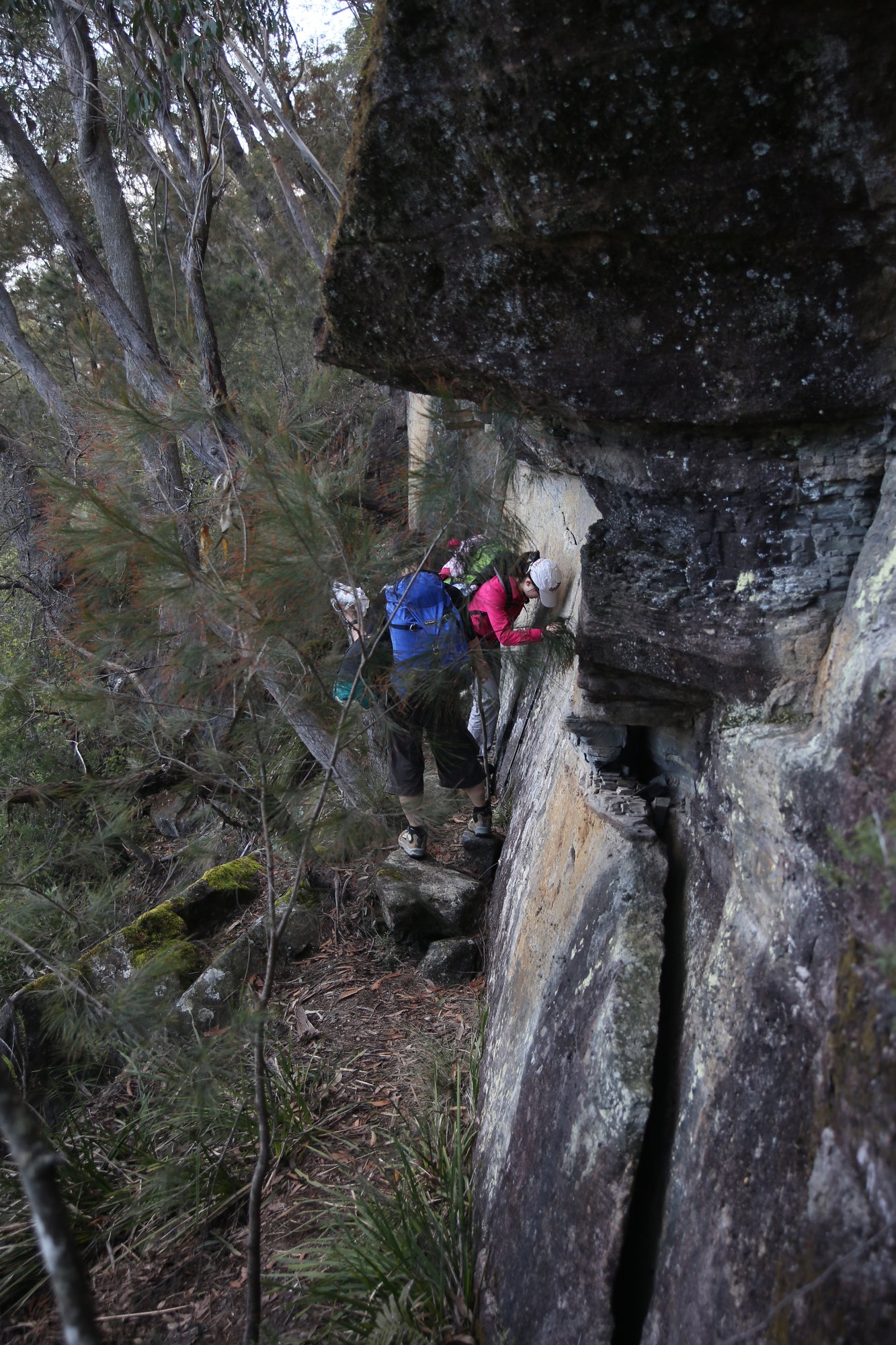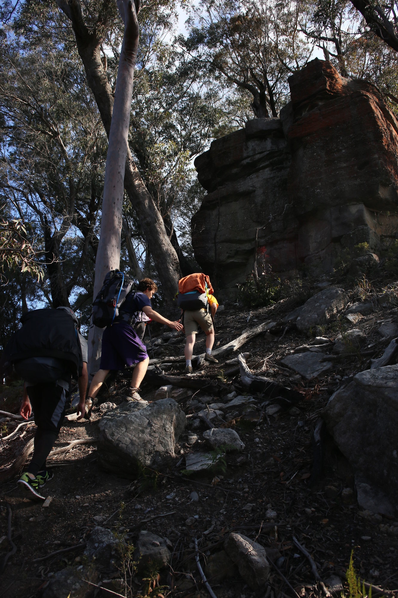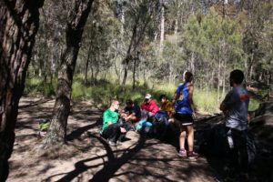 We headed up Blackhorse Gap and picked our way through a currently tricky beginning to the Wombat’s Parade. After the first 50m it was reasonable going, and not particularly wet. No leeches were seen. Luke found a coal seam in the side of the cliff and picked up a couple of pieces to test in the campfire.