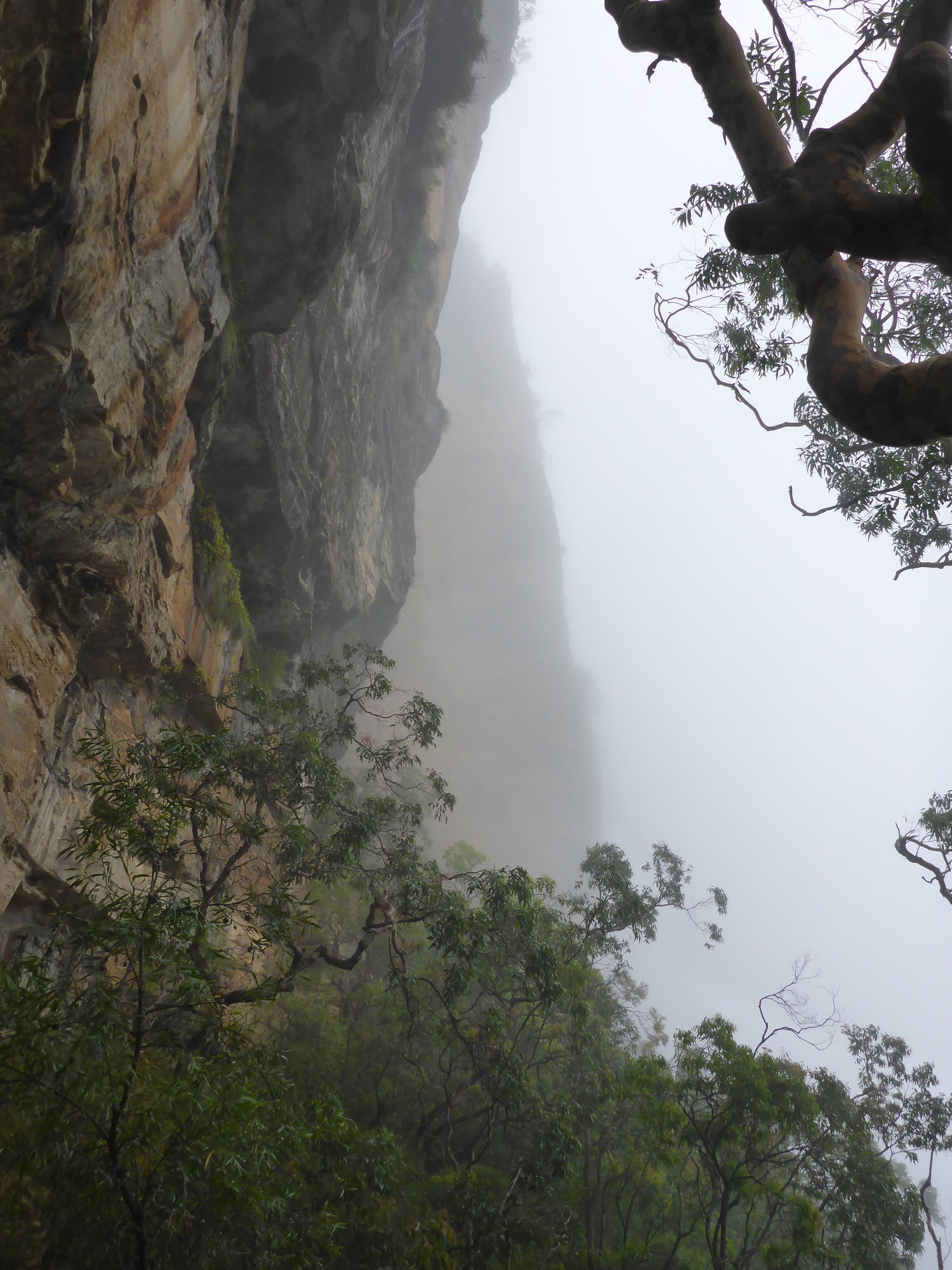 There is simply no better time to see the Valley of the Waters than during or just after rain, the beauty of the waterfalls in full force being our primary reward for braving the weather. At the bottom of the tourist section of the falls, we had to make a decision whether to continue with the original plan to follow the creek down on unmaintained track to Vera Falls and back, or chicken-out and stick to the tourist route. We chose the latter, heading off on the National Pass to Wentworth Falls, finding a sheltered lunch spot along on the way. The usually spectacular views from the track had been replaced by a uniform blanket of white cloud.
