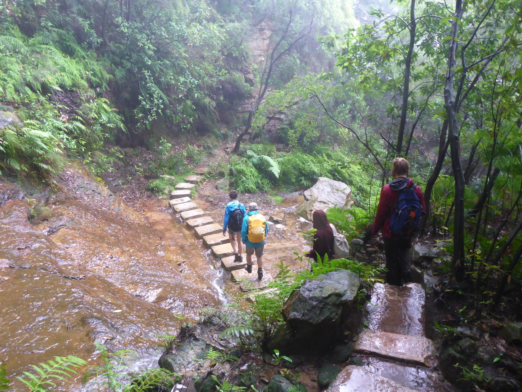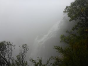 Barely visible through the low lying cloud until we were at its base, Wentworth Falls was in fine form in the rain. While the wind had (thankfully) been mild all day, there was enough reflecting off the end of the valley to be throwing (what felt like) a good proportion of the falls directly at us. After enjoying this horizontal shower, we headed to the top of the falls, up to Wentworth Falls car-park, and back to the Conservation Hut via the short-cut track. Highlights of the short-cut track were a pair of Lyrebirds and the numerous large puddles which served useful splashing purposes. Finally out of the rain, we enjoyed hot drinks and nibbles at the Conversation Hut, discovering (to our great surprise) that no-one had picked up even a single leech throughout our very soggy day.