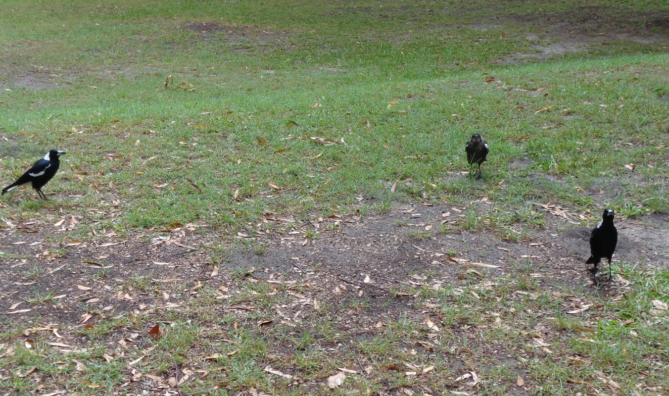 By the time we reached the south end of Pearl Beach however, the rain had stopped. I tested the water and found it warmer than the air! (In fact it was 24 Deg C versus 23 Deg C air temp.). A check of the radar though warned of another rain band approaching so we made for the Crommelin Arboretum where there is shelter. At the Arboretum we were visited by a Magpie family who had an offspring who it appeared had outlived its welcome, as one of the parents pecked it mercilessly when it came to us begging for food. A Kookaburra also cam down to check us out. There were no Bush Turkeys – unusual – maybe they like us were sheltering from the rain. Another check of the radar (what would we do without it?) showed the rain easing off but another coming in 10 minutes. I figured that that would be just enough time to reach a cave/overhng on the Pearl Beach-Patonga fire trail, which was our next section. And it proved to be the case.