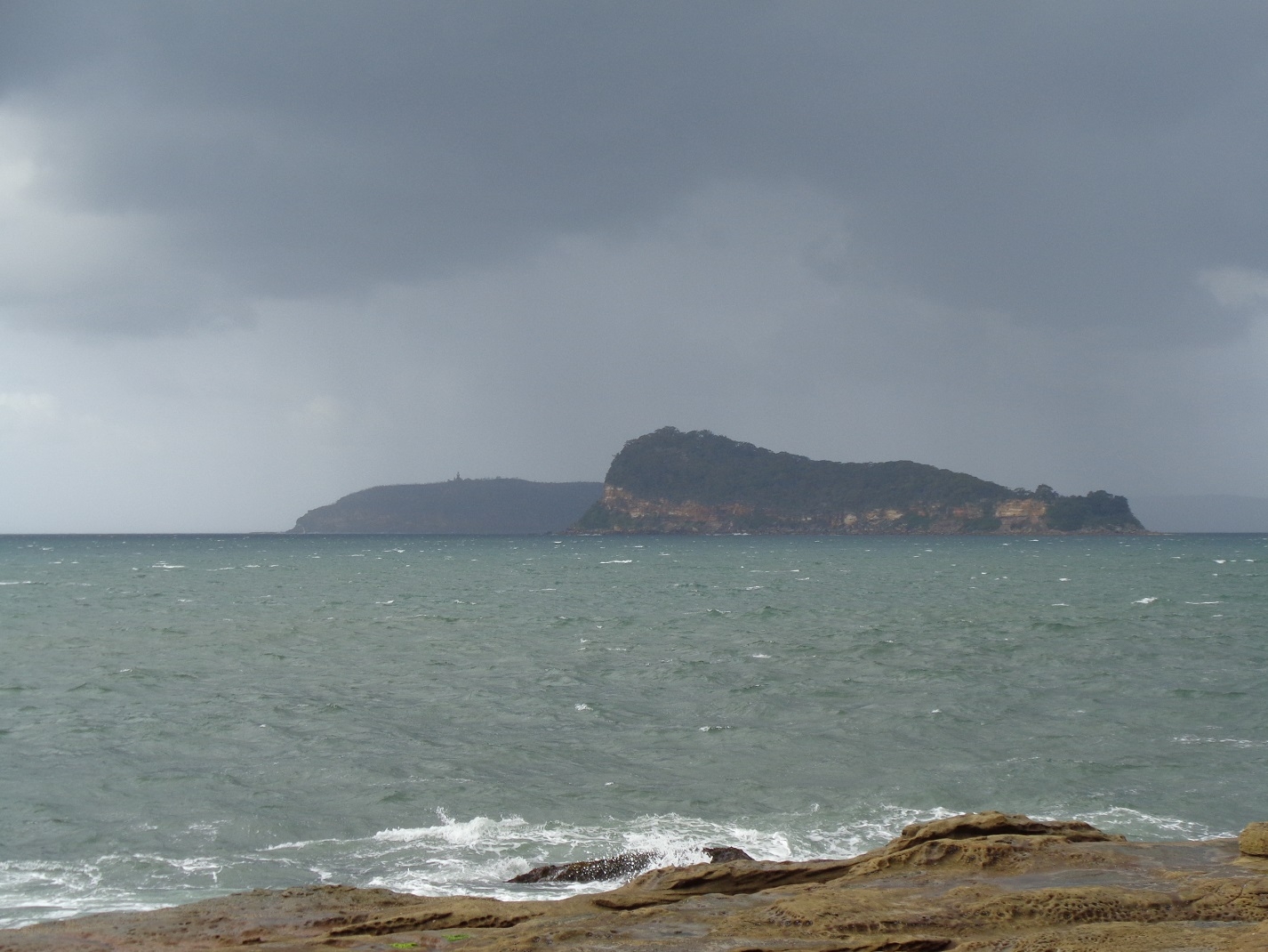 So we set off for Umina Beach, only to find that hundreds of cars were parked in the car parks and surrounding streets due to a major Surf Carnival being held at the beach. So we drove to the south end of Umina Beach and managed to get the last two parking spots available. Then it was rock-hopping around the headland below Mt Ettalong, and noted the sunlight shining on Broken Bay but also the dark clouds over Palm Beach to the south. It was also a low tide, which helped. So we clambered up the rocks top the path below Mt Ettalong (which Gosford Council prefers people not to use, in case rocks fall on you), and straight into a strong wind and it started to rain. Rain covers came on and we continued down to the north end of Pearl Beach. Walkign along the sand the rain, which had briefly eased off, came back with a vengeance, big heavy drops driven by the wind.