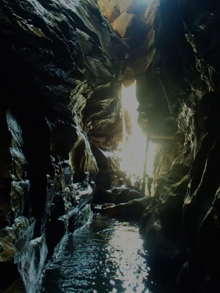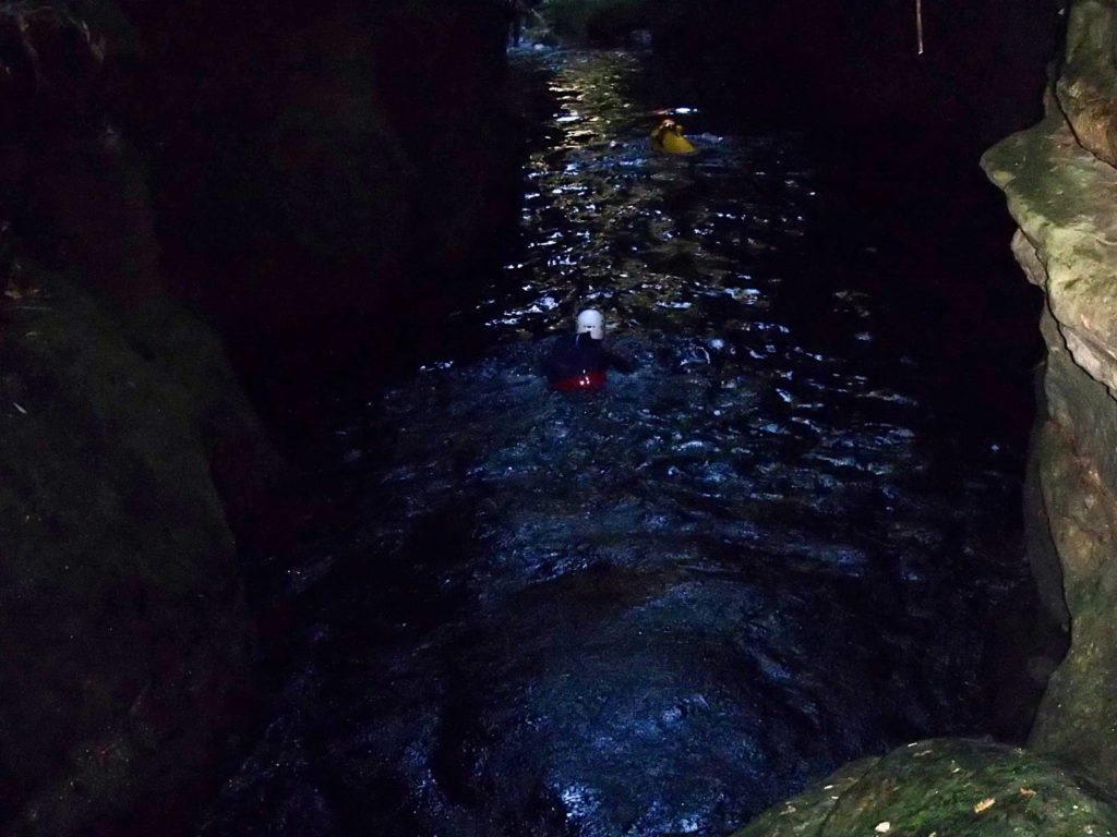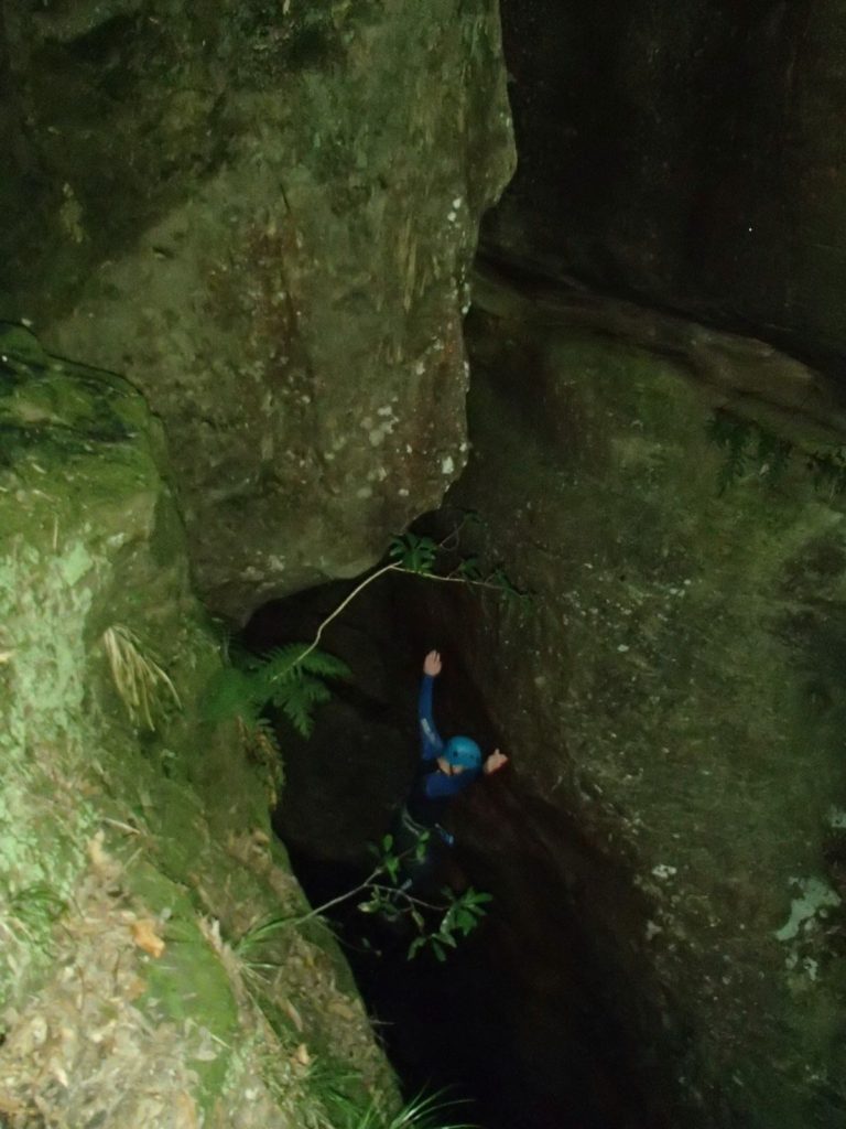 After the main drop was a short, cold swim and then a climbdown/abseil. The broken fixed rope has not been replaced and we did not have a scrap of rope with us to replace it, so we abseiled.