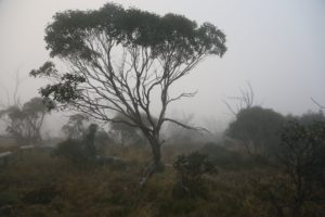 All too soon, we needed to get down, to allow for the time it would take to navigate our way down again. It was just as challenging , to make sure we stayed on the right bearing to meet the saddle at the correct point for our exit via the faint track. With a few corrective route adjustments along the way, this was accomplished, and we got back to the saddle by 3.30pm. It was a pleasant ramble back to the cars, but we were certainly tired by the end. A quick look at Forestry Hut near the Yankee Hat carpark ended our walk before heading back to Canberra for a nice Thai meal. Hiswaty left us there to join some Canberra friends, but Jacopo and I went off to camp on Mt Ginini afterward to see the night sky. It was a lovely starry vista from the alpine tops, but in the morning we woke to thick mist, which made for very nice “snow gums in the clouds” photography.