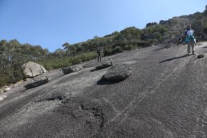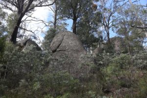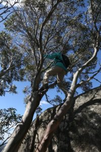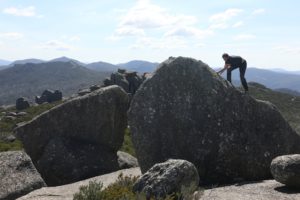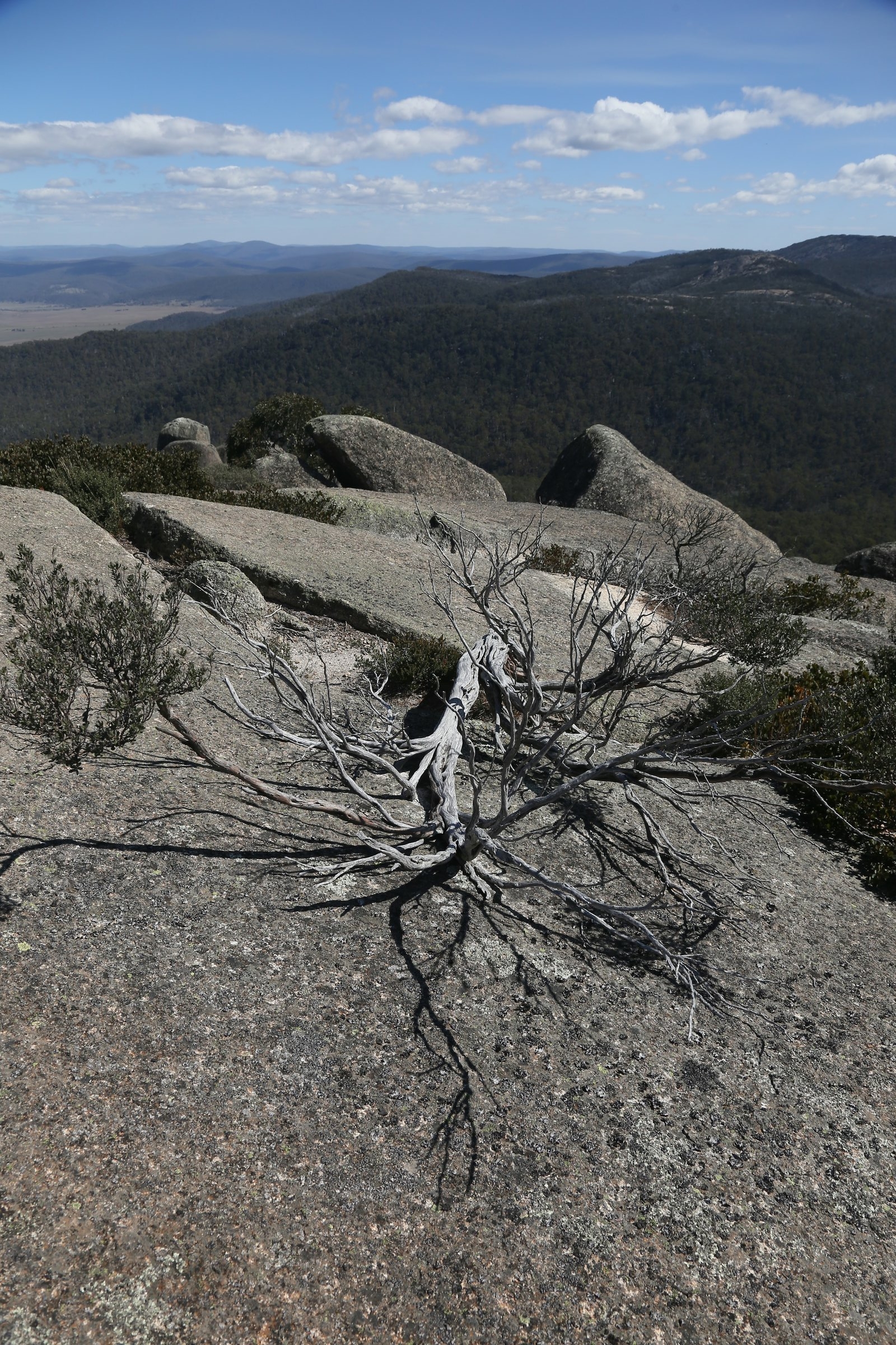 Slowly as we got higher and higher, the views began emerging. The large granite slabs and boulders made the climb much more exciting than just being in the bush. It was a mind game to find a way through it all. The summit trig loomed overhead, and about 90 minutes after leaving the saddle we got the last scramble up to the top. This entailed going up a steep rock gully then clambering up a dead tree. I think there may be an easier way up the other side, but this is the way we got up and down. The summit was wonderful. Rock stacks everywhere, and views as far as Canberra, the Brindabella Ranges, Tinderry ranges, and all the way to Mt Jagungal in the south. Jacopo enjoyed doing some scrambles up other rock stacks while Hiswaty and I took time to explore the summit.