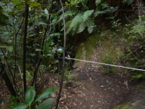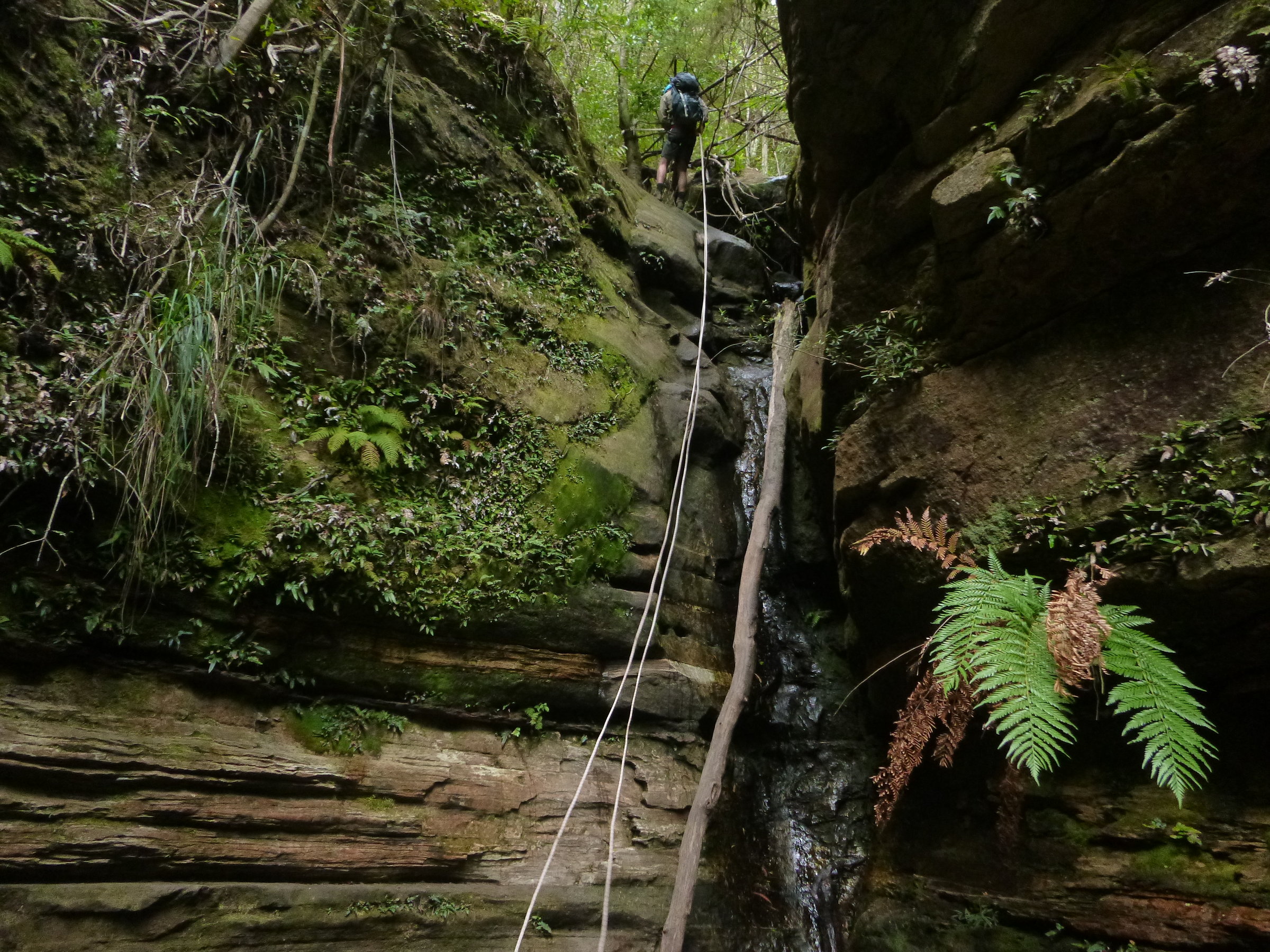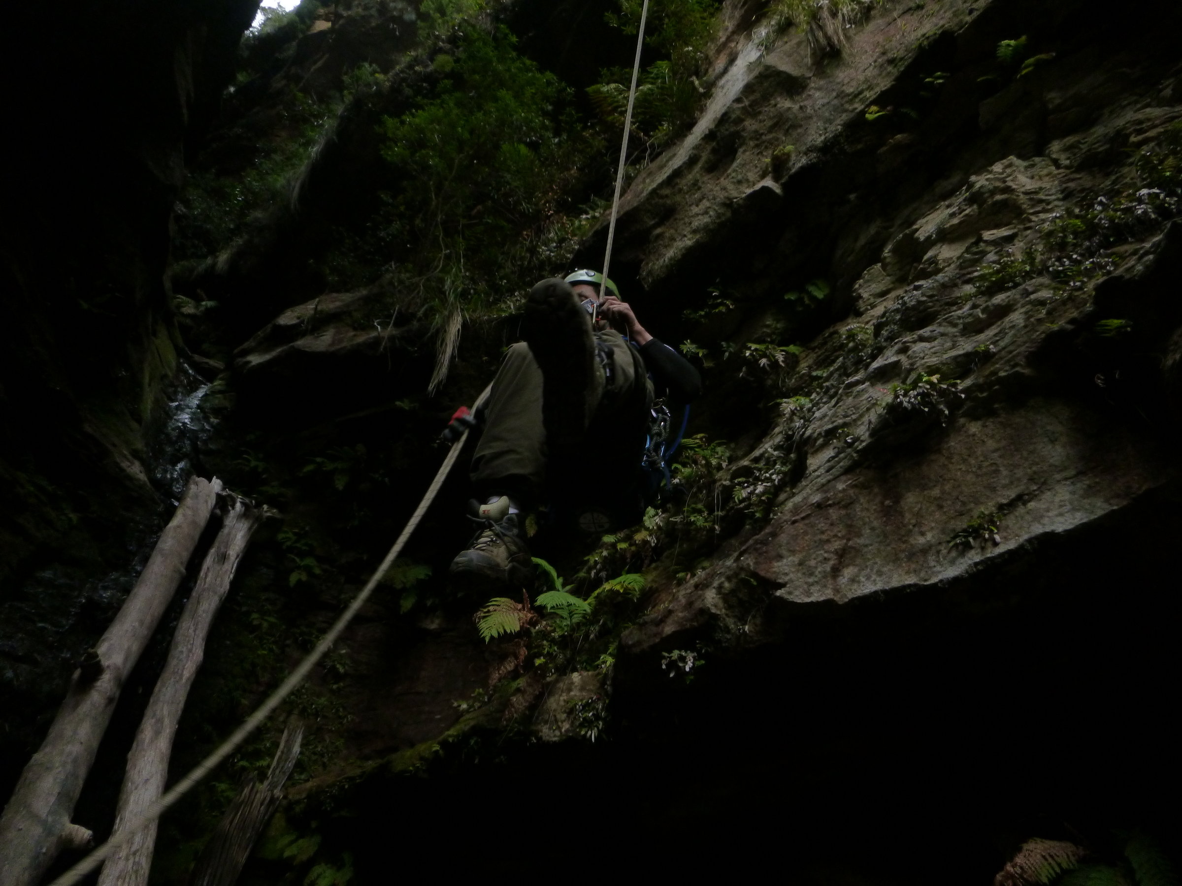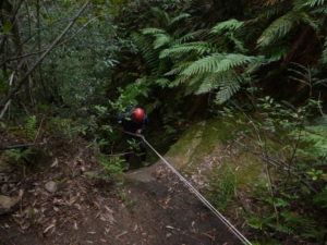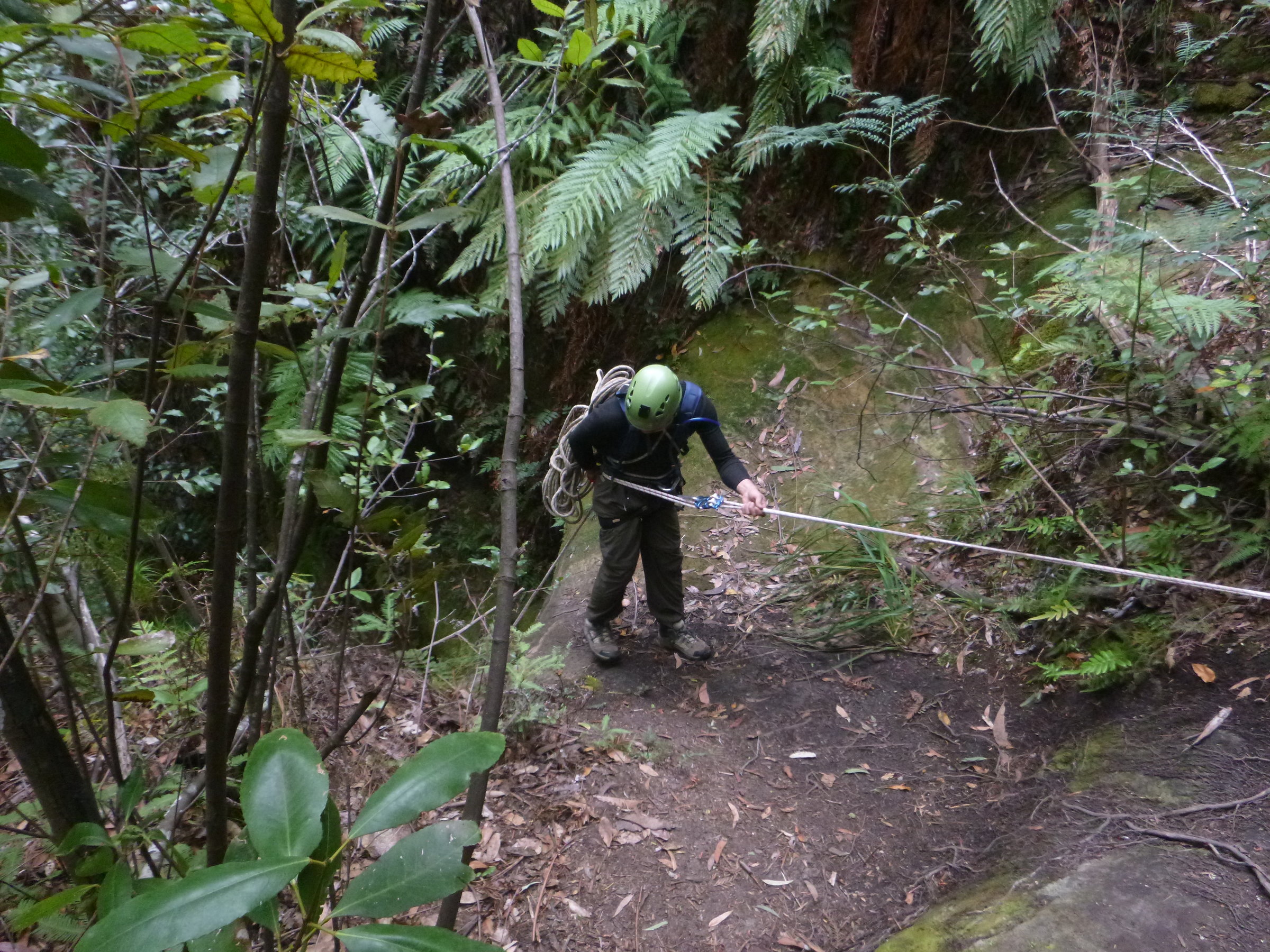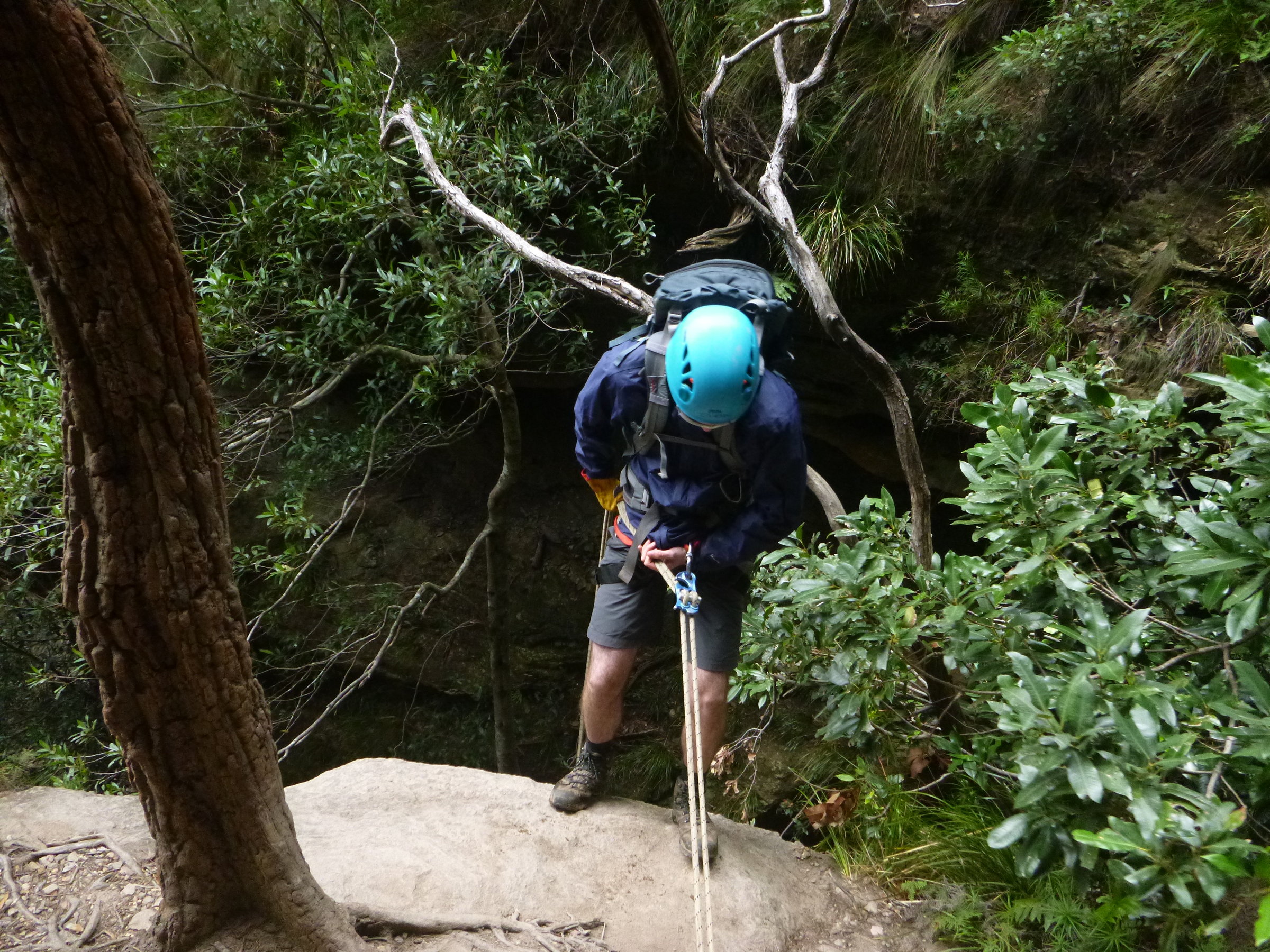 We all met around 8am at the Mt York car park. Once everyone had arrived we organized the gear we would need for the abseil training. I decided the best location on Mt York to train beginners was the gully. I set up the first abseil on the 3 metre slab and gave a demonstration of how to correctly fit a harness, helmet, attach yourself to the rope with the descender and abseil safely enforcing the A-F safety checks. Tony was explaining and demonstrating the importance of the bottom belay technique.