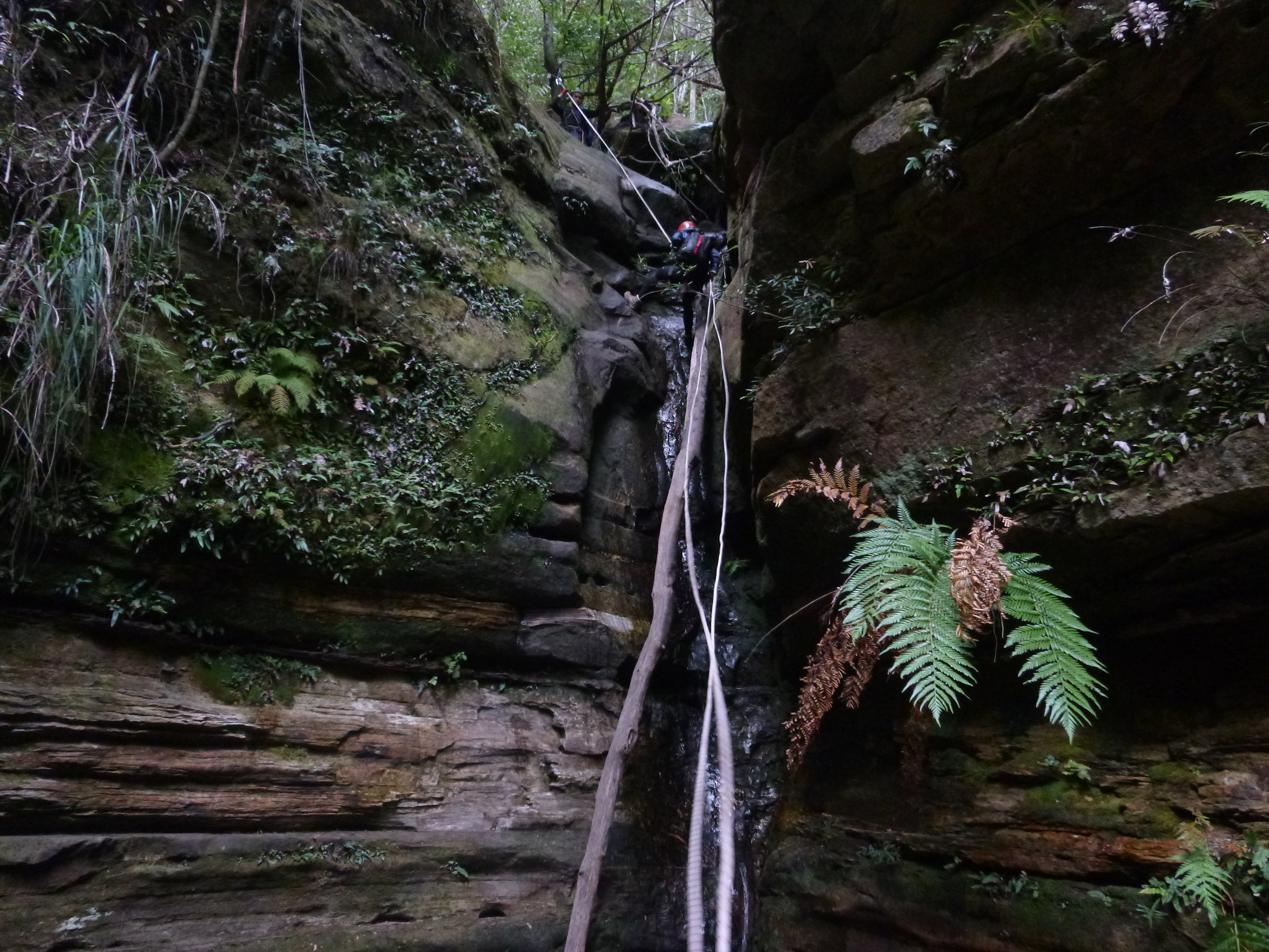 Further downstream we carefully made our way down the 9m abseil with some very light spray from the trickling waterfall. Some care is needed here to traverse onto the narrow rock ledges to your left near the bottom of the abseil to avoid getting wet in the pool below which is normally only waist deep. The abseils are only a very short walk from each other in Jugglers Canyon and before long we reached the last abseil the 20 metre overhang. The last time I did the overhang abseil was about 5 years ago from a sling on a small tree very close to the cliff edge on the right hand side as you face downstream. This time I went around to the left ledge and found a strong anchor point of 2 steel ring bolts and a steel welded ring drilled into the rock with a dyneema sling connected them together. Everyone abseiled the overhang safely with a bottom belay.