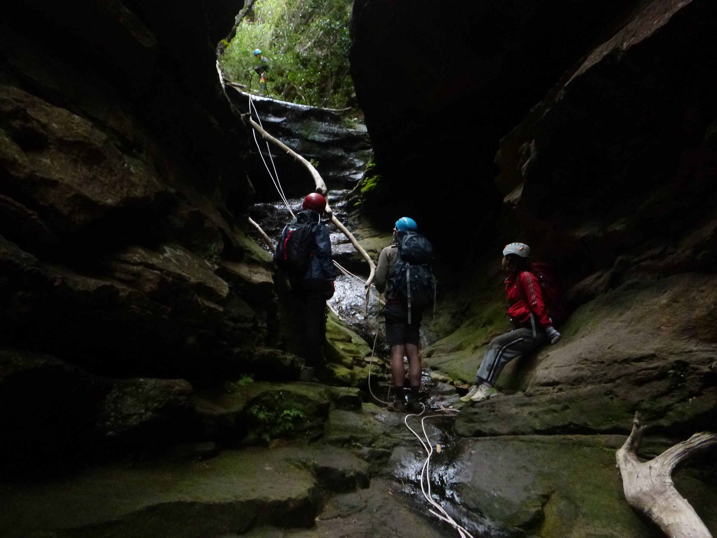 The first abseil in Jugglers is very easy the second one is more difficult as it gets narrow towards the main drop of two boulders wedged together to make a narrow overhang abseil or you can use the rocks either side to step your way down.