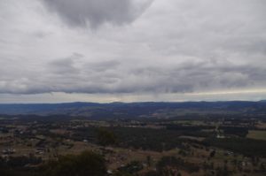 After lunch we set off along the track of Cox’s Road. This was the first of the roads down the escarpment (1815) and although it was a road it is also rather steep. It starts off though fairly level passing near to farmland. At a gate there is a stile which is commonly seen on tracks in England but rare in Australia (see photo). There is also a series of posts in the ground at a couple of places for walking across boggy areas – helps to avoid track erosion. Then the track rose rather steeply to eventually reach the top at Mt York. Along the way there are relics of the original convict working such as bridge footings. The view at Mt York extends out to Hampton on The Jenolan Caves Road. The rain radar showed light rain in that area, but visually it was “Virga”, which is rain (or probably snow in this case) that doesn’t reach the ground.