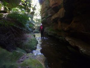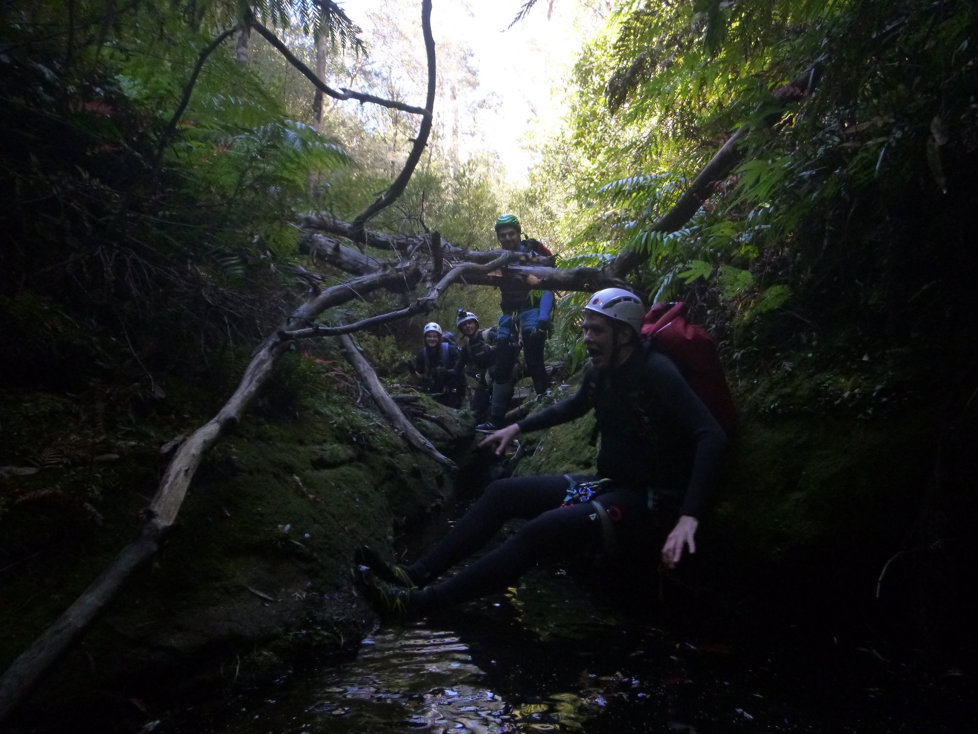 This route bypasses through the cliff faces that is described in Rick Jameison book as “a short abseil may be needed at the bottom”. In fact there are no abseils in Hobnail at all so if anyone is going there on a future trip there is no need for abseiling gear. There are some blockages with logs and boulders that are in the canyon constriction. This is what Rick Jameison might be referring to in regards for abseiling but we got through them easily by sliding down underneath through the boulders.