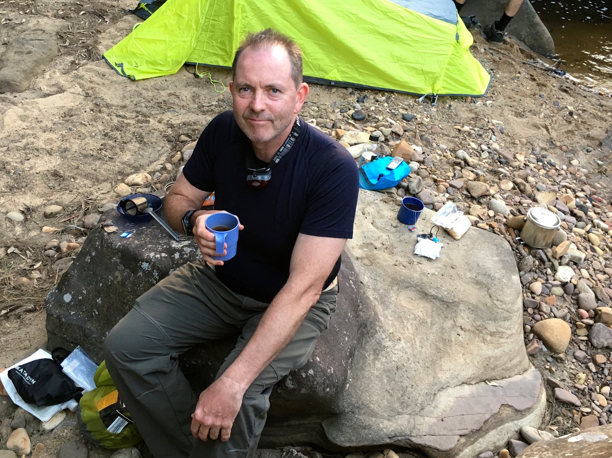 It had been ferociously hot on the hillside, so we had another swim and lay in the water for a good while to cool down before pushing on. Around 7.00, we found a nice flat area where another big creek joins the river, just west of Mt Hay. Here we set up camp and enjoyed another session in the natural spas. Frankly, we had not moved much further towards our destination, but we had passed a lovely day scrambling around a beautiful wilderness river, so we were fine with that. It was clouding over and looking potentially thundery, so even Nathan put up a tent, although it was so warm that with the extra insulation from the tent there was no need for a sleeping bag until the early hours of next morning.