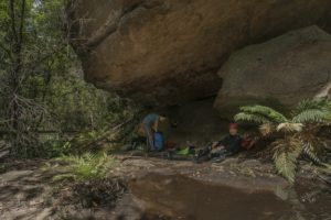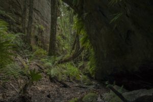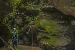 Once at the creek, just follow the creek – pretty simple- a bit of a scramble here and there and then we came to a deep overhang just near the first abseil. This was a pretty spot – time for a pic and donning the wetsuits.