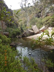 Our last stop was the exit point – we didn’t take the usual spot, instead not far past there was a rock platform about 5 metres up which provides plenty of dry space to get changed and an easier yet still steep climb out. It is very closed to Serendipity’s exit. Due to my possible thump gripping and hip problems, plus the most recent rain and my heavy backpack, Tony had decided that the normal exit with the 7meter vertical rocky climb up was not a good choice.