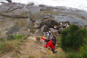 The sea had quietened down from yesterday when I had gone to check the condition of the beach, but it was still fairly rough and murky after the many days of rain we have had. High tide wasn’t due until 1.30pm so it was still safe to do rock hopping and walk a fair way along the rock platform, as long as we kept well away from the edge. At the point I did a group photo, and also there were a couple of board-riders taking advantage of the swell. Then I noticed that Nolan had gone off for a better view of them. She got a bit too close to the platform edge for comfort. I called her back, advising her that a big wave might catch her and she would die! Sure, the boardriders were at the edge, but they had wetsuits and a large surfboard – we didn’t! (I can’t emphasise too much the importance of staying away from the edges of seaside rock platforms, even if the sea looks calm.Too many rock fishermen have been drowned that way when pulled into the water by an unexpected big wave. Keep that in mind for the Burning Palms walk of 9th April).