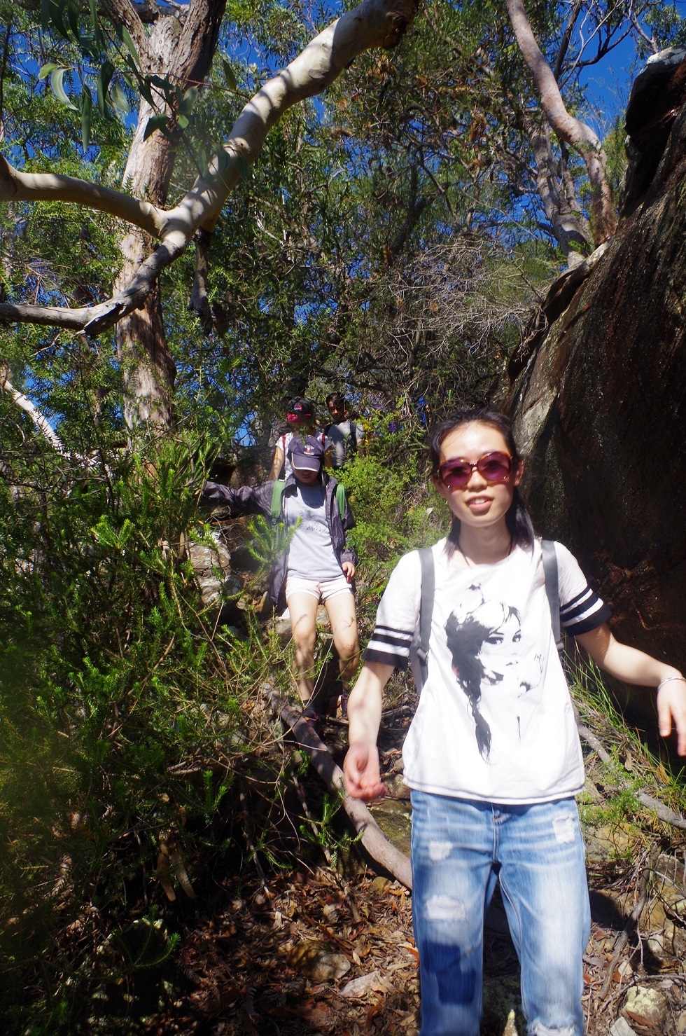 After a good rest we set off again to tackle the steep climb up the Great North walk. It rises steeply by a series of rough stone steps. Near the top we paused at another lookout, and that view was quite different under sunshine compared with what we saw earlier at Warrah Lookout (see photos). Then it was back down the Pearl Beach Fire Trail until we reached the old track that we had come up earlier,and dropped down it until reaching the Uni Field Station. Then it was a road bash along the dirt road in a pleasant forest with houses tucked away within it, until reaching Pearl Beach. By this time the tree removal people had gone so there was no need to detour round the site of the damaged tree via the Arboretum.