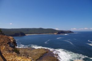 After lunch we set off on the last leg of the walk towards Kilcare Beach. We initially took the track to the Maitland Bay visitors Centre but turned left after about 200 metres for the track to Bullimah Beach and Kilcare (still called the Bouddi Coastal Walk). This is an undulating track which a few grades but also fairly muddy. After a while it enters a forested section which provided welcome shade. We reached Gerrin Point and took in the view, and also spotted 3 eagles circling overhead. From Gerrin Point the track becomes a mixture of dirt track and boardwalk. This section attracts a lot of people from Putty Beach (there is also a short side track to Bullimah Beach). The track stays almost at the clifftop edge until reaching Putty Beach (which is actually the north end of Kilcare Beach. Noticeable at the track’s end was the growth of larger trees here, a result to re-vegetation efforts over the years, including the removal of Bitou Bush. (This is a plant imported from South Africa to stabilise sand dunes, but it has managed to escape and become too prolific).