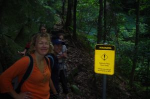 So we turned left to head towards the Vera Falls Track. Near the start there was a tree with a fluorescent pink ribbon tied to it (just in case you couldn’t see the fairly obvious track), but thankfully there were no more pink ribbons until near the junction with Vera Falls track much further on. We continued along this track which varies between being fairly wide and level and being vague and rocky. At one point it follows a rock ledge just half-metre wide for about 20 metres then suddenly becomes a wider track again. I lost count of the number of muddy creek crossings we did (maybe 10). The track passed through a forested area with tree ferns – very picturesque. I asked Ségolène if there were rough tracks like this in France. She said yes, but high in the Alps, not in forest!