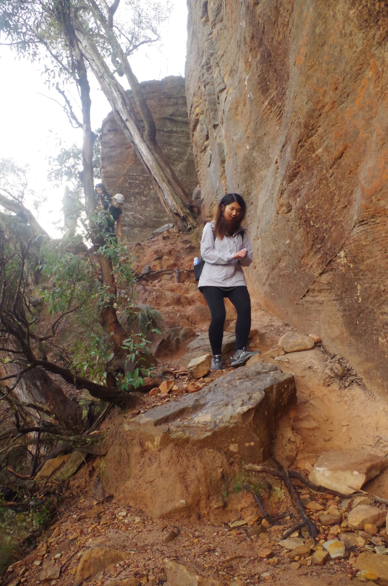 We set off in very light passing rain, and headed for Pulpit Rock. There, the view was totally obscured by fog, so we went straight down the dirt road to the start of the Little Zig Zag Track (see photo of map). This track goes down into Kanimbla Valley via a series of zig-zags (switchbacks). At the end of the third zag there is a side track to Bushranger’s Cave, which we went along for a look. The fog had also cleared by now too, giving a clear view over the Valley below. The light rain had also stopped. The track to the “cave” is steep, slippery and crumbly so care needed to be taken. It comes to the base of cliffs studded with rock climbing bolts, and access to the cave itself appeared to be up a steep slope; not impossible but quite difficult. So we decided to give a visit to the Cave a miss, and made our way back to Little Zig Zag track. It wasn’t too long before we reached the start of the Rienit’s Pass track (going straight ahead, as was done on a walk several years ago, takes you to a dirt road in the valley). Rienit’s Pass turned out to be fairly steep in places and also quite crumbly and slippery from the recent rain. Easy to slip in places, and one of the girls nearly went for a long slide, catching herself in time!After dropping down the track starts to climb again – still with several slippery sections. It comes to the top of the talus slopes and the base of the cliff lines where there is a side track to a waterfall. Reece led the group to look at the waterfall while I went further along Rienit’s Pass to look for a lunch spot (as the rain radar showed another rain band coming). Reece reported that the waterfall was disappointing, with not much water.
