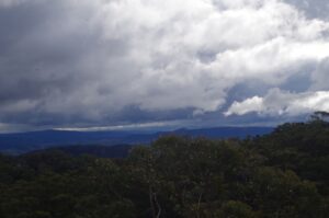 I found a large overhang which I thought was Ross’s Cave (but wasn’t) but big enough for shelter while the expected rain band came through. Here we stopped for lunch. After lunch we set off and eventually came to a point where Rienit’s Pass crossed and at one point followed the Mt Piddington-Pulpit Rock track (done on a previous walk last year). Reece discussed heading straight up Rienit’s Pass which would end up at Carlisle Road. I opted for the longer but easier graded track back to Mt Piddington via “Witches Glen”, which also avoided a road bash. At Witches Glen we found a campsite complete with a fireplace and sleeping covers, but unoccupied. From there the track continued until reaching the road right next to the short track up to the top of Mt Piddington.