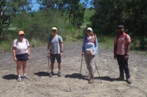 The 4.30pm tide time also meant a much later than usual start for this walk. Most of us met up at Central Station for the 11.29am Kiama train which got us to Helensburgh a bit late at 12.30pm (late running seems normal for the cinderella South Coast Line). After the usual toilet break at the ststion, I led the group to look at the waterfall on Wilsons Creek near the railway. It wasn’t running very full, and that also meant that the Hacking River, which we would ford later on, would be easy to cross. Unfortunately my camera’s flash failed to operate at the Falls, as apparently the very bright reflection off the water stopped the flash, so I could omly get dark outlines of the walks members there (I am presently using an older computer with Windows 7 which doesn’t have photo editing available).