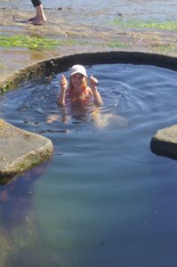 By this time (4pm) most visitors had left so the pool site wasn’t crowded. Most of us were happy to have a look and take photos, and Roxana went in for a dip. We stayed for about 30 minutes then, mindful that the tide was about to turn, started making our way back to the south end of Burning Palms Beach. At the “lawn” we had a 10 minute break so that Roxana could change out of her swim clothes, and I ate an iced bun which I still had, left over from lunch. That proved to be a mistake as I found out an hour later.