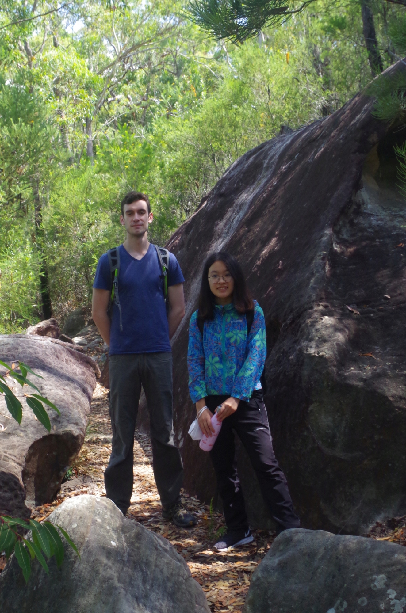 Fortunately the next section of track was level and then dropped down to a shady section to cross Campbells Creek. Noted berries from a Lilli Pilli Tree there although they taste very astringent if you try to eat them raw. From Campbells Creek the track rose again although not as steep as the first climb. There are a few places where it levels out, then rises, repeated 3 times. We came across a hive that European honey bees had made in the hollow of a gumtree. We left it alone. After another 10 minutes and another gradual climb I spotted a small rock overhang which would make a suitable lunch spot, with shade and a sea breeze blowing in.