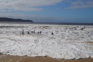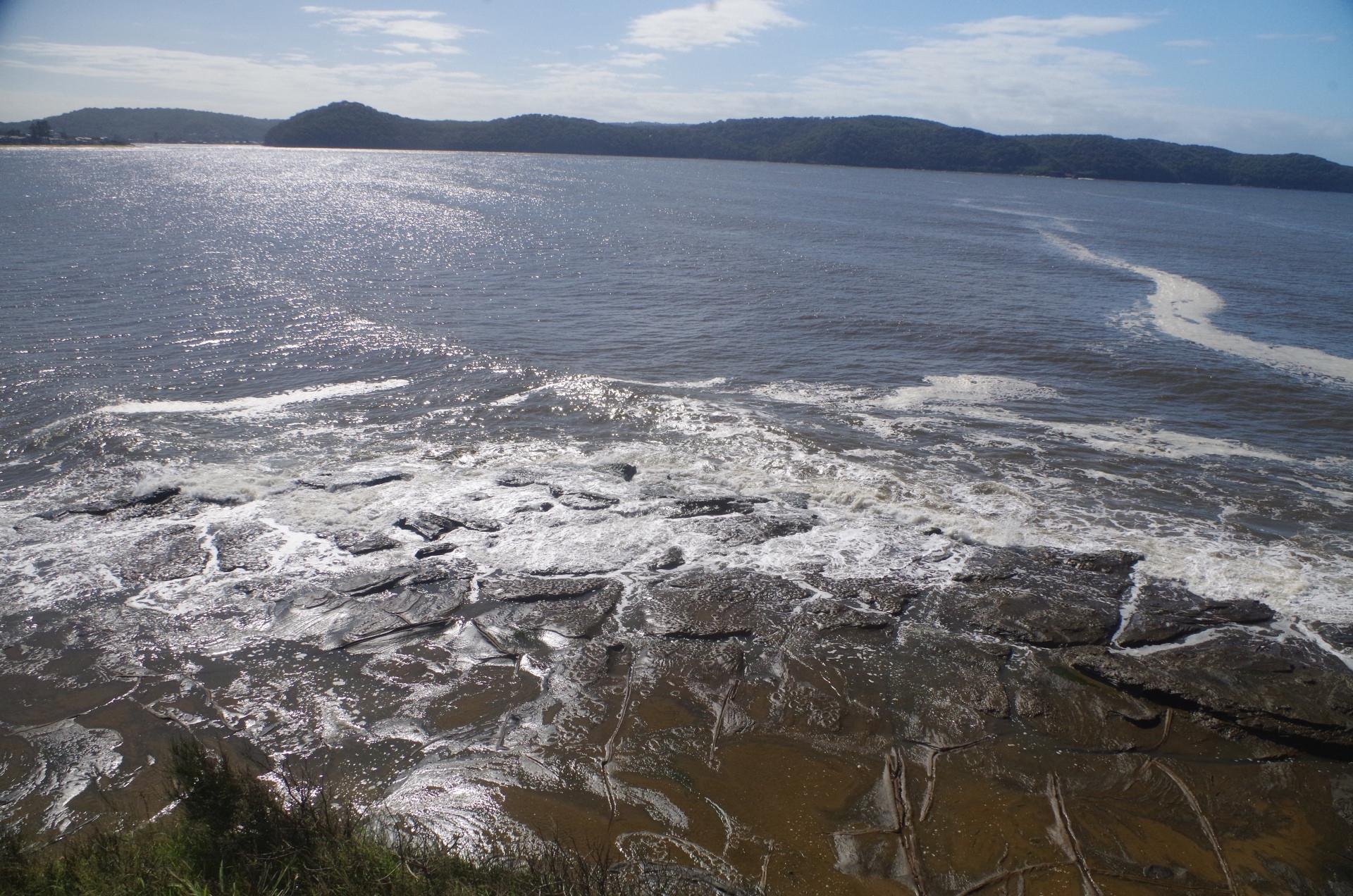 We got off three streets back from Umina Beach and when we arrived there, there was quite a surprise. The normally 40 metre wide beach had been reduced by the high tide and the recent storms to little more than one metre wide! It was also littered with a great amount of driftwood brought down the Hawkesbury River in the recent floods. The beach was also closed to swimming, although a few board riders in wet suits were out on the waves. Then we came to where Umina lagoon enters the sea, and normally it is a trickle or nothing at all. This time though it meant wading in thigh-deep water to get across it; the recent rains had filled the lagoon to overflowing. To find an alternative route around the lagoon we went into the adjacent camping area, only to find ouit from campers that the only entrance, and thus only detour route, was to go back to where we first entered the beach! This left us with no choice but to wade across the lagoon entrance. We all made it across without getting clothes too wet.
