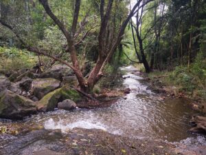 We had a great group of people come on the Walk of Art bush walk, with myself, Chloe (SUBW president), Angela, Danah, Peggy and Eric. After catching the train from central we had a short ride out to Hornsby station, where afterwards we walked for 10 or so minutes to the start point of the track. The track itself was well formed, although just on the dirt ground without any paving or boardwalk. After snaking through Gum trees we reached stairs, which descended down durther into the valley and connected to Ginger Meggs Park. From there we continued with a short jump on stumps to cross the creek (pictured) and we began to ascend seeing a lizard along the way and coming around Waitara Creek where we had another river crossing (pictured). At this point we began to ascend and once nearly reaching the peak (as we were so hungry but didnt realise it was only 1 more ridge above, and the map showed we were right on it), we stopped for a long lunch break, enjoying the lovely weather. Once we continued on, the bush became wetter, filled with lots of ferns and, unkowingly, filled with leeches! After Danah noticed 1 on her we suddenly realised they were all over our shoes and if we stopped for even a second they would crawl up through the tred of our shoes and onto our legs! Luckily leech land only lasted for the last 10-15 mins and all was fine once we got to concreted ground (or so we thought). At this point we saw another lovely lizard (pictured) and got a group photo! As we started to walk back through subrubia we thought we were on the way directly to the train station, but unfortunately we had to ascend the 339 stairs (yes we counted) from the beginning! After this it was a breeze to get back to the station to get the train home to central. It was only once we were on the train hat we noticed there was still a leech stuck on my leg! Thanks to everyone’s help we got it off and a plaster on. Et voila, the first Walk of Art trip was complete! All along the way we were getting creative by taking photos either with our phones, digital cameras, and film cameras! Big thanks to everyone who came and made it an awesome trip, can’t wait for the next one!