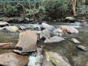 On reaching the River, however, it was running quite swiftly and the ford where the trail crosses it, normally quite shallow, was under about half metre of water apart from exposed rocks. We searched for a better crossing and one was found a bit downsream which had several rocks whch could be used as “stepping stones”. Most of the group crossed there, but I was concerned that with my Achilles’ Tendon still sore and maybe affecting balance on the rocks, I didn’t want to risk having my pack fall into the river, with camera and phone! So I simply decided to step out into the water at the ford, with shoes and socks (fortunately, woollen socks). Using a long stick to test the depth (although the water was fairly clear) I avoided any deep holes. Dila followed me across. Then a short walk to where the fire trail meets Lady Wakehurst Drive. Noted that there is a new locked gate there to deter 4-wheel drivers (although trail bikes can still get past it, it seems, as we saw three earlier).
