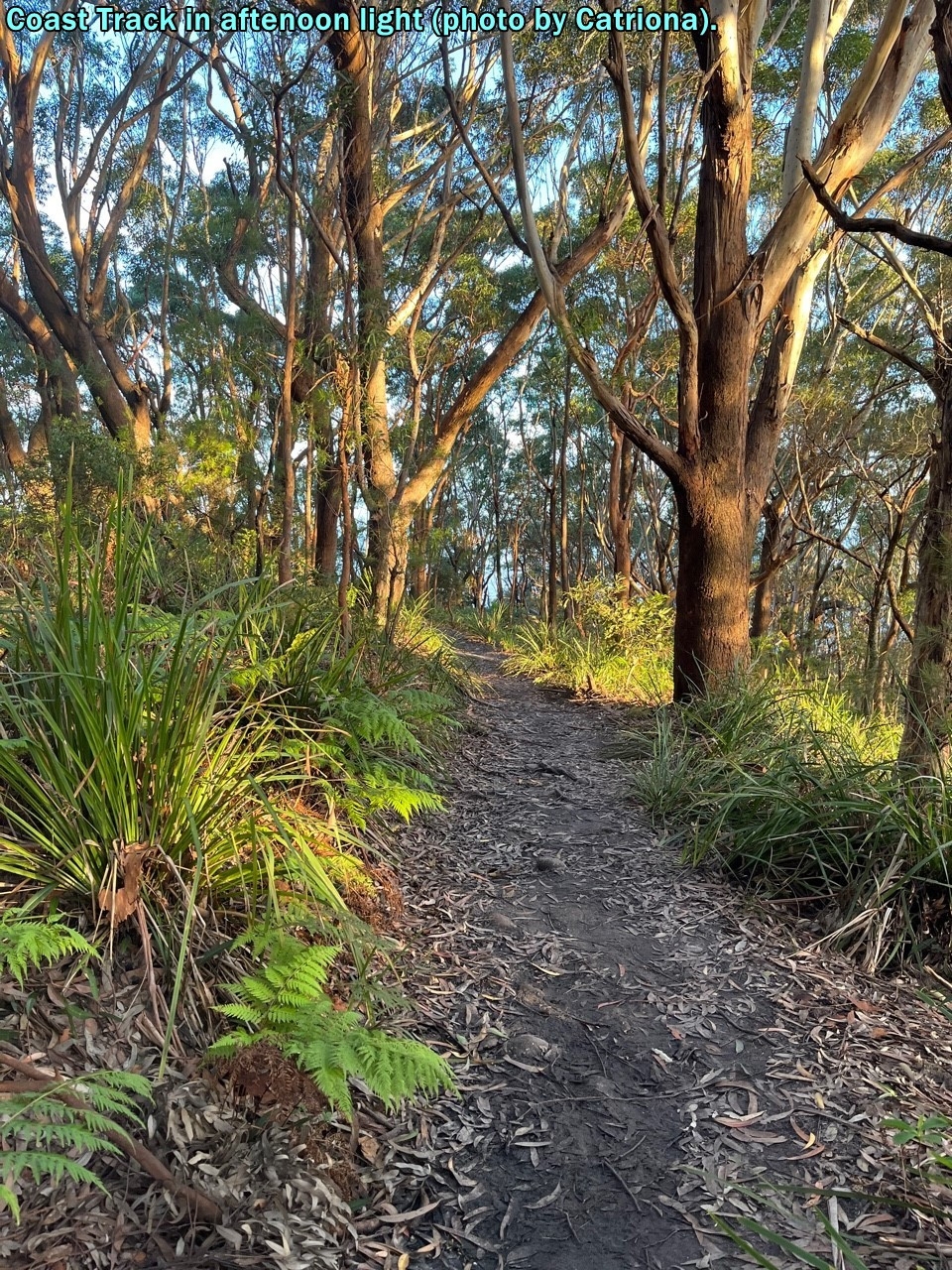 A stop was made at the track junction with the Ridge Trail to remove leechs as we were mostly out of leech territory here. Some insect replellent was use to get some off! We then set off for the final leg of the walk along the Rodge Trail and then the CoastTrack to Otford Lookout. By then the sun was getting low, illuminating the trees with a golden glow as can be seen In Catriona’s photos. At Otford Lookout we were 23 minutes to train time so we would make it. At Beaumont Road Ting took over carryig my pack after I have got my phone and wallet out, and according to Google it was 10 minites walk to the station (and Google turned out tobe correct with respect to my own slow speed because of the Tendon problem). We arrived at the station with 4 minute to spare until train time, although the train was 4 minutes late anyway.