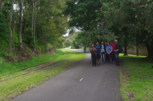 By that time the clouds were thinning and some blue sky was starting to show. With this promising sign, we set off for the start of the Fernleigh Track, which is actually a rail trail along an old private colliery railway as far as Belmost, 13km away. We were only going as far as Burwood Road, 3.6km along. Because it is a paved two-way bicycle and walking trail on a steady 1 in 40 gradient, and has bubblers (faucets in U.S. English) and at least one cafe near the track, the walk on this section qualifies as a “hike“. About 2km along we came to Fernleigh Tunnel, 181 metres long, and Kaiyang posed in