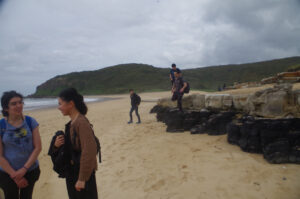 So we set off along the beach, and noted some of the industrial archaeology to be seen there in the form of the remains of the old rail line, and old wagon parts and wheels. By this time it had become cloudy again, and at one point we felt a couple of rain drops, but very very light and brief. Even so, I considered that having lunch on the beach might get us caught in rain (there’s almost no shelter there), so I decided to press on to Merewether Beach where there are shelters for lunch. As the tide was low and the sea swell was only slight, crossing the rock platform under Merewether Head was safe and easy. (The rock shelf, by the way, is considered part of the Yuelarbah Track, even though there is no actual track across it).So we headed for the setas and shelter to settle down for lunch. As it urned out, those few drops were the only “rain” we got all day. Vyom and Hassan went in for a swim.