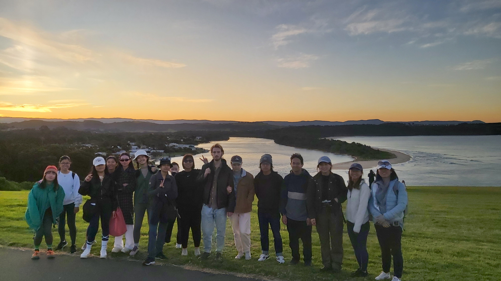 Skipping the Bombo Headland itself, we continued towards Jones Beach, stopping at Cathedral Rock along the way, which is an interesting geological rock formation created by volcanic activity. Reaching Jones Beach itself, the group decided that they preferred to walk along the street instead of the beach. This section is the least interesting bit of the walk, and so we carried on towards Minamurra Lookout. At the Minamurra Headlands (is that what its called?) there is a whale watching platform. Unfortunately, however, we only saw a splash from a whale pod once during the trip, and it was quite far away. It was a 20 minute walk to the station from here and our train was leaving in 20, so we did not have time to enjoy the view much, but we did take a group photo there. In my opinion this is probably the most scenic part of the whole walk, especially since due to our timing we were there at sunset (the golden hour for photography).