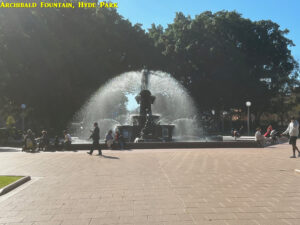 Anyway at 1pm Alper and Qi arrived, and after a photo in front of the Emden Gun, set off to walk the length of Hyde Park. First stop was the War Memorial with place names of battle sites from WW1 (it was built in 1934 prior to WW2). Then it was across Park Street to the northern part of the Park and the Archibald Fountain, named after the art lovinf philantropist who paid for it, as well as funding the annual Archibald Art Prize which continues to this day.