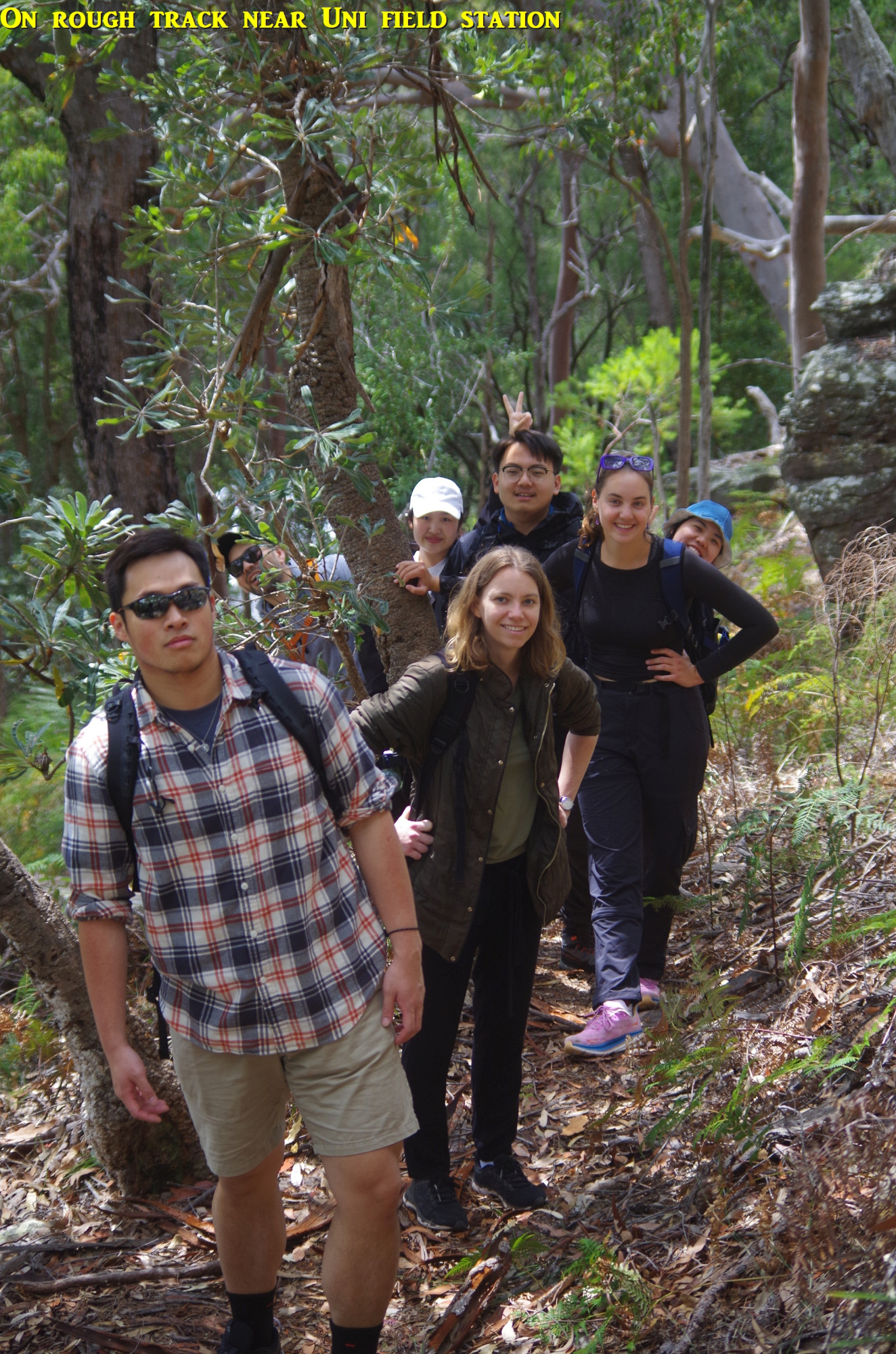 From the beach was an unavoidable road bash to Crommelin Arboretum, although the road itself is through housing in pleasant shady woodland. On arrival at the Arboretum we were disappointed that we were unable to enter it as there was a music festival called “Beatles Rebooted” on that afternoon and access was for ticket holders only. That meant we just continued up the road to its end at the Sydney Uni Biology Field Station. From there a quite vague track winds its way up the hill and under the cliff line to eventually reach Pearl Beach Fire Trail. It is indistinct and easy to take false side tracks which lead nowhere. And of course can’t rush this path as a lookout has to be kept for snakes. I advised some people not to be looking at their mobile phones while walking, especially on this track. As one goes along this track there is evidence that it was built up in some sections in the past and it is believed to have been an old horse track to Patonga before a road was built to that village.