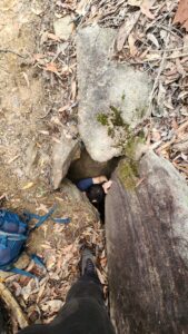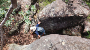 After resting for a while, I wanted to take a picture of that narrow rock crevice with my cell phone, but as soon as I put it down to enter the cave, I realized that there was another bushwalker there coming upwards. We helped her with her backpack and went on our way. We had some fun scrambling experiences after that.