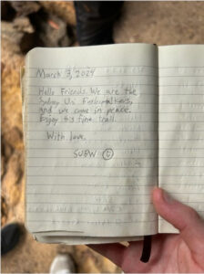 Below that boulder was shark’s head cave and we arrived at the cave to find some hand towels stored in a waterproof bag. Inside the cave we found a small box with some tea and coffee left by others and some postcards from spring wood bushwalker club, we also found two notebooks, one of which recorded the arrival of bushwalkers in the cave since 2005 and we left each of our signatures on it. On the other note David also left a message. We also heard some sounds below us in the cave that we both thought might have been from eric, but unfortunately there was no signal in most places on the route and I did not receive a text message from eric.