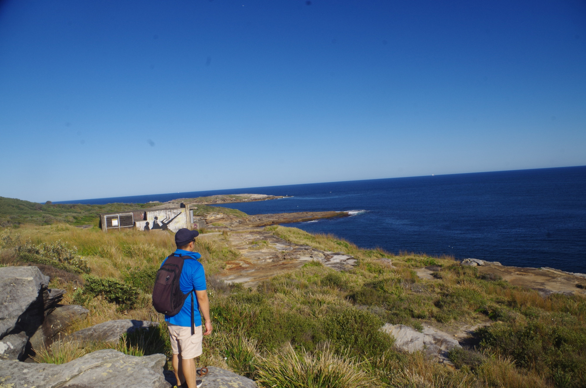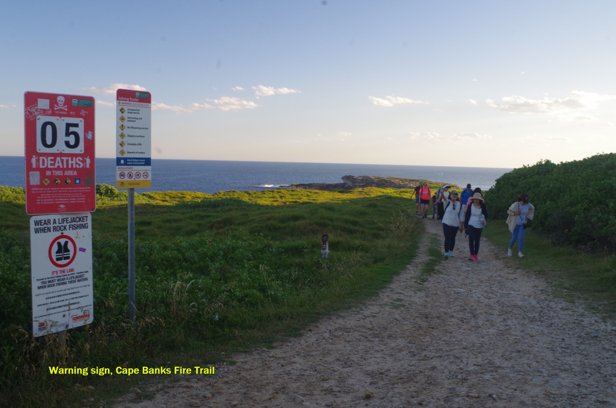 There was a bit of rockhapping along this section of track, and we suddenly came to places where the track intersected with some paths for golfers! There were signs asking walkers to give way to golfers if there were any (none there today). Then the track headed south to Cape Banks which is the north headland of Botany Bay. It’s an interesting and lonely windswept spot and has the same pure white sandstone seen in the Royal National Park along the coast south of Bundeena. After looking around there we returned back to the junction of the Cape Banks Walking Track with the Cape Banks Fire Trail. This trail follows the coastline, and at one place there is a warning sign about the dangers of rock fishing along this part of the Coast. See the photo of the warning sign with its grim statistic of 5 deaths here in recent years. From there the trail turns inland until reaching the base of the Westpac Life Saver Helicopter Base, then along Cape Banks Road which is a bitumen narrow road (watching out for vehicles). This goes for about 1.7km and passes through the middle of a golf course, although that is not obvious. Maybe need to watch out for stray golf balls sometimes!