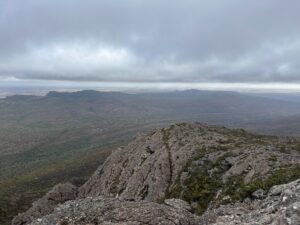The summit of Mt Abrupt gave clear views over the southern side of the ranges, surrounded by some unreal scenery. All the mountains form a line stretching all the way north, perhaps also explaining the popularity of Grampians Peak Trail, a multi-day hike traversing through the national park. The woodlands comprising eucalyptus and grass trees become shrubs towards the windy summit. Endless farmlands spread towards the flat plains on the southern and eastern ends of the summit.