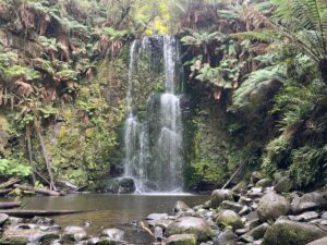 After Twelve Apostles the road travels inland and we branched off the main road towards the Otway rainforest, stopping at Beauchamp Falls. The walk to the waterfall travels through magnificent rainforest. Paul and I were walking at the back and the ecosystem always amuses us. Rainforests are everywhere- from the tropics of Queensland down to Barrington Tops, Jamison Rainforest in Blue Mtns and Otways to the south. It almost looks like anything can be a rainforest regardless of climate except there’s one thing in common- rainforests have no grass. It’s an advanced ecosystem where there aren’t nutrients for grass to grow, leaving just ferns and trees with their canopies. Looking up the canopies cover most of the ground, except that they don’t actually touch or overlap between trees which is interesting to see. It’s a mix of trees along the way including Mountain Ash and beech trees.