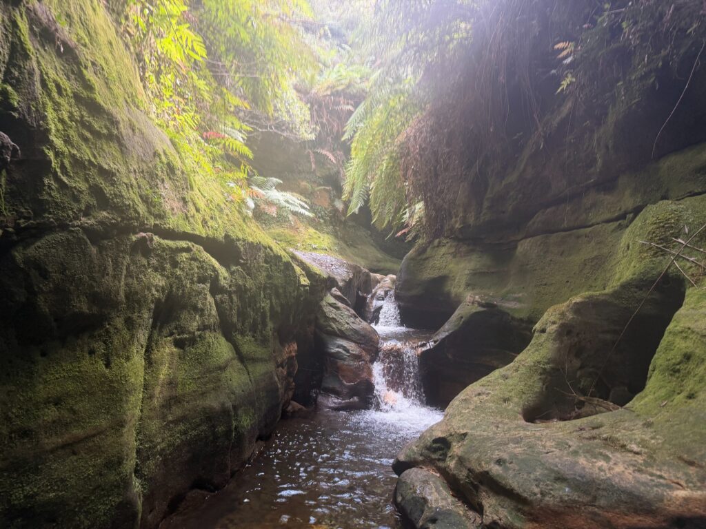Three of our committee members have decided to try out a short canyon on a quiet Monday morning. With some morning miscommunication, Vincent, our Walks Secretary, was on the train an hour early. He was found sitting in a train at Parramatta while I was still crossing Parramatta Rd at Homebush to get to my bus stop. Vincent’s train time coincides with the time when school kids go to school, which added a bit of chaos to the journey. The chants of “6-7! 6-7 !!” echoed as the old trains curved up the mountains towards Wentworth Falls. My train was a Lithgow-bound Mariyung train, trying out the new trains on the Blue Mtns line for the first time. At least there isn’t trash on the train, unlike their older counterparts. Many people have complaints about the new train, but all I care about is cleanliness and the new trains certainly outperform the older ones.