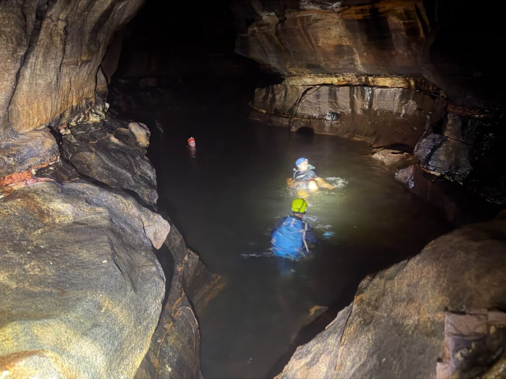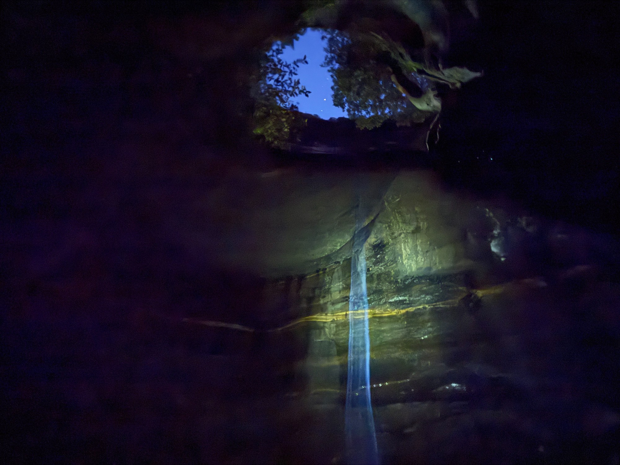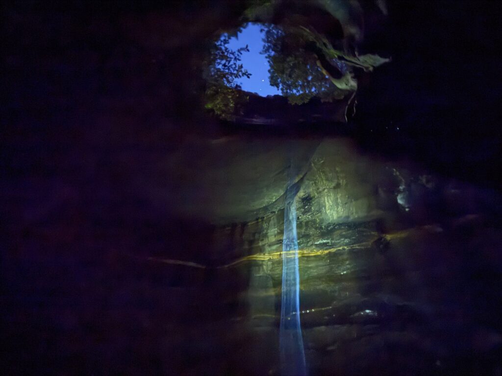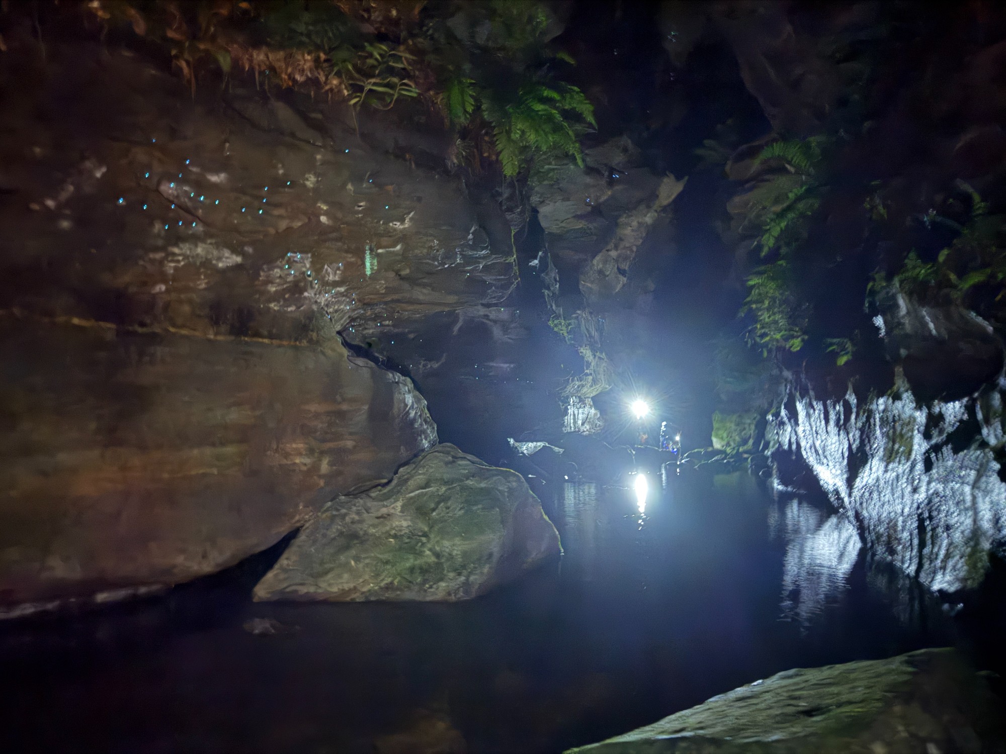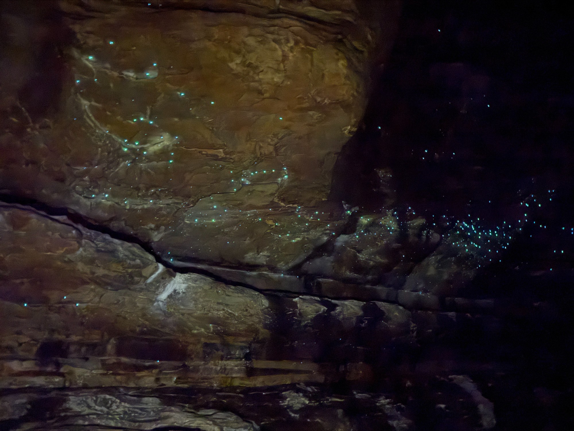 Probably the nicest picture of glowworms I’ve got throughout the entire night. The canyon then opens up from its constriction, still with a few glowworms near the overhangs. Fortunately, we can attest that no monsters live in this canyon.