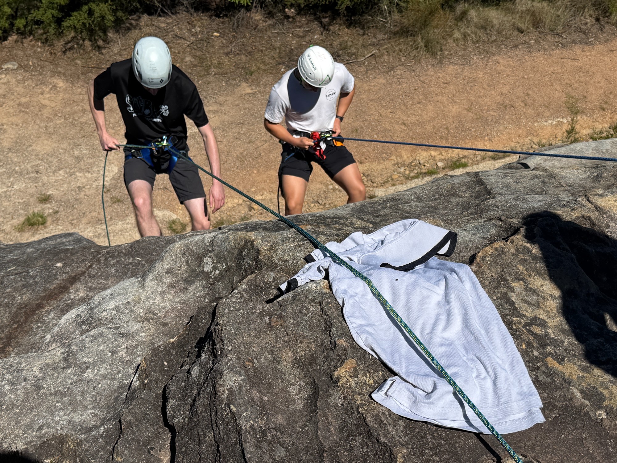 Station 2 is a ~20m pitch, with 2 sets of anchors, one on each side of the cliff. We’ve rigged the abseil on both sides, giving us more space to practice prusiking afterwards. Everyone did their safety checks independently and headed down, with Adam bottom belaying from beneath. Another feature of this pitch is a simple overhang at roughly 2/3 of the abseil, a common feature in canyons. Abseiling around an overhang can be tricky for beginners, but with a bit of practice, everyone went down without much issue.