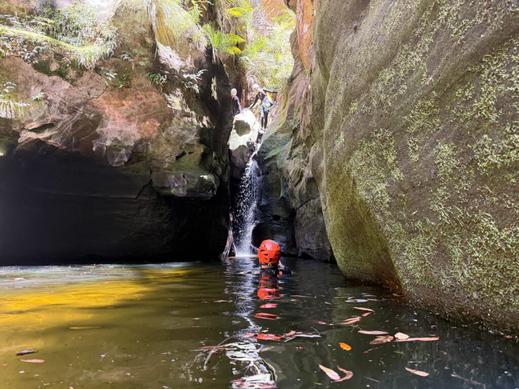 We went to Cafe Lurline for breakfast, as recommended by Adam. The big breakfast was really good, albeit a bit pricey as expected. We then headed back to the station, joining the rest of the group at the bus stop just outside of Carrington Hotel. As part of my routine prep for beginner canyons/abseils, I’ve requested everyone to complete a pre-reading before coming, covering how the equipment works and common abseiling scenarios. Everyone completed their pre-reading except one person (Liam), which means I can skip through the boring speech on how everything works.