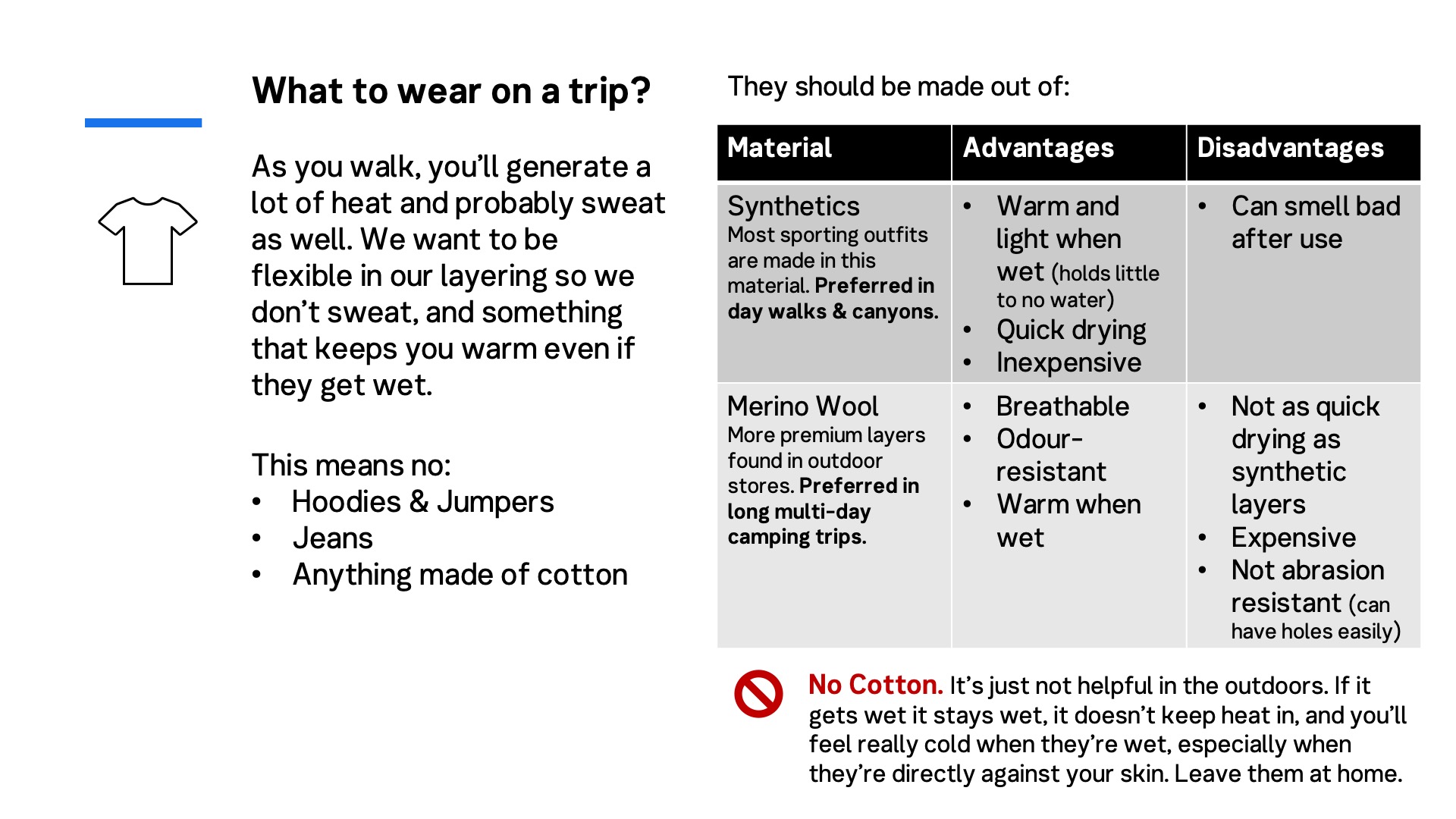 Make sure you wear comfortable and stable shoes for walking. If you don’t have special hiking shoes, the best thing is to wear some runners. They should suit you well on most walks. They must be enclosed on your toes- don’t wear sandals or thongs.