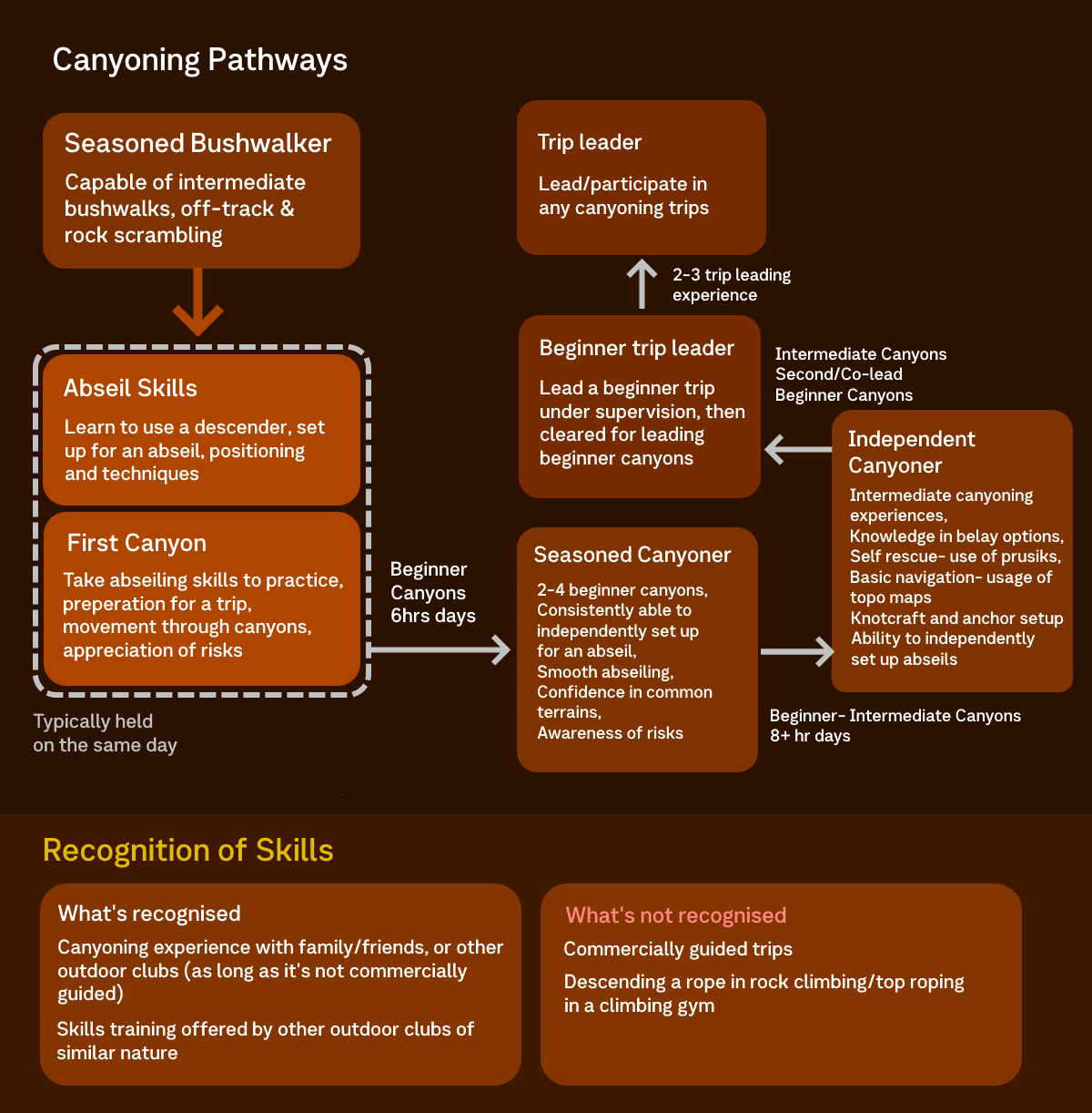 To further upskill, you’ll be invited to another rope skills day. This time, we will teach you how to self-rescue so you can get out of trouble, and potentially how to set up abseils. We’ll also encourage you to start leading beginner trips or take up more leadership roles in canyoning trips. Having that knowledge is important as you go on more difficult canyons, and you’ll also be more likely to be accepted on canyoning trips if you have that skill.